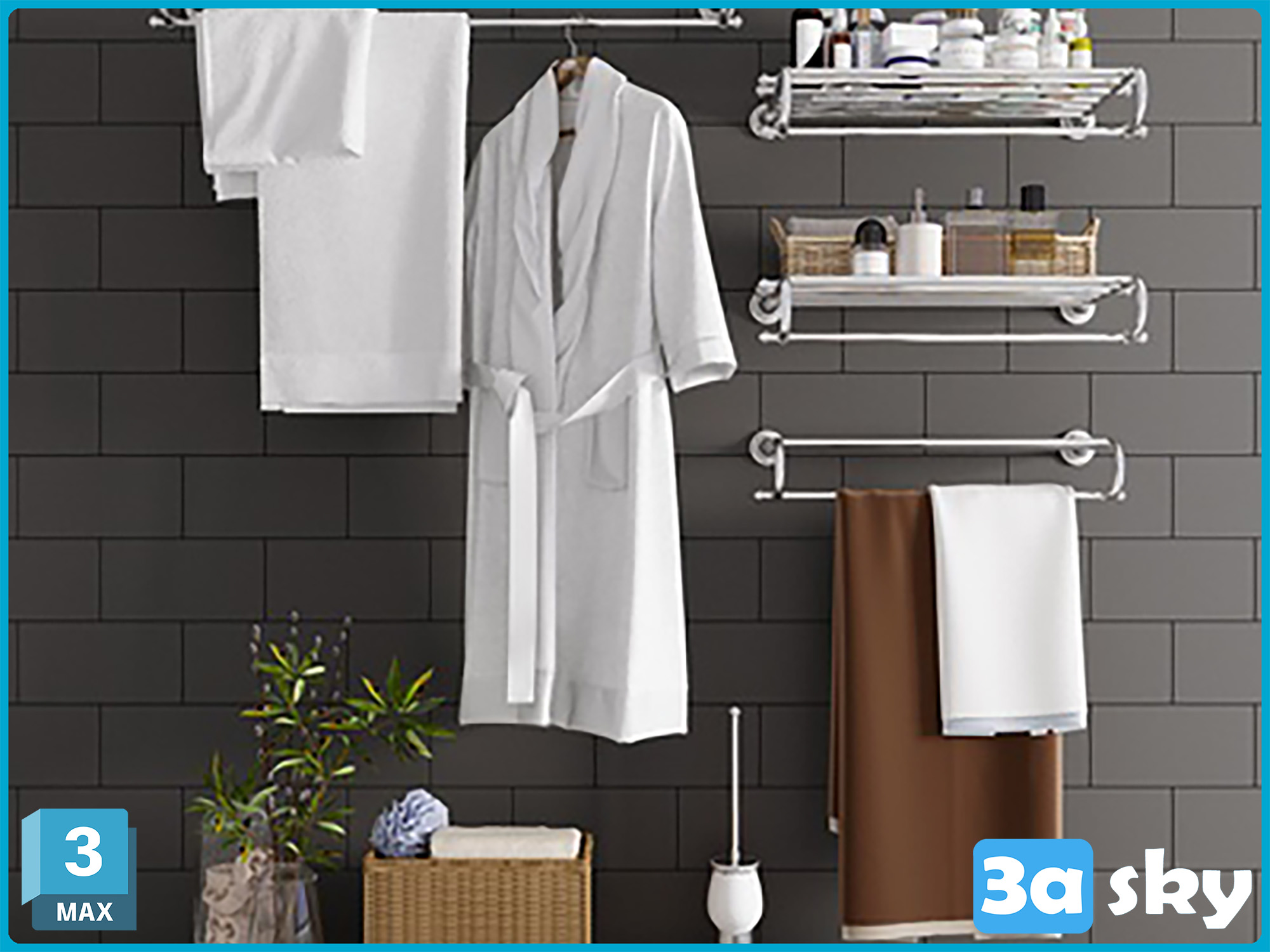 This 3D model showcases a modern bathroom and WC design created using 3DS MAX software. The detailed rendering highlights the contemporary layout and interior design elements of a stylish bathroom space. Explore the intricate details and realistic textures of this 3D model for inspiration and visualization purposes.