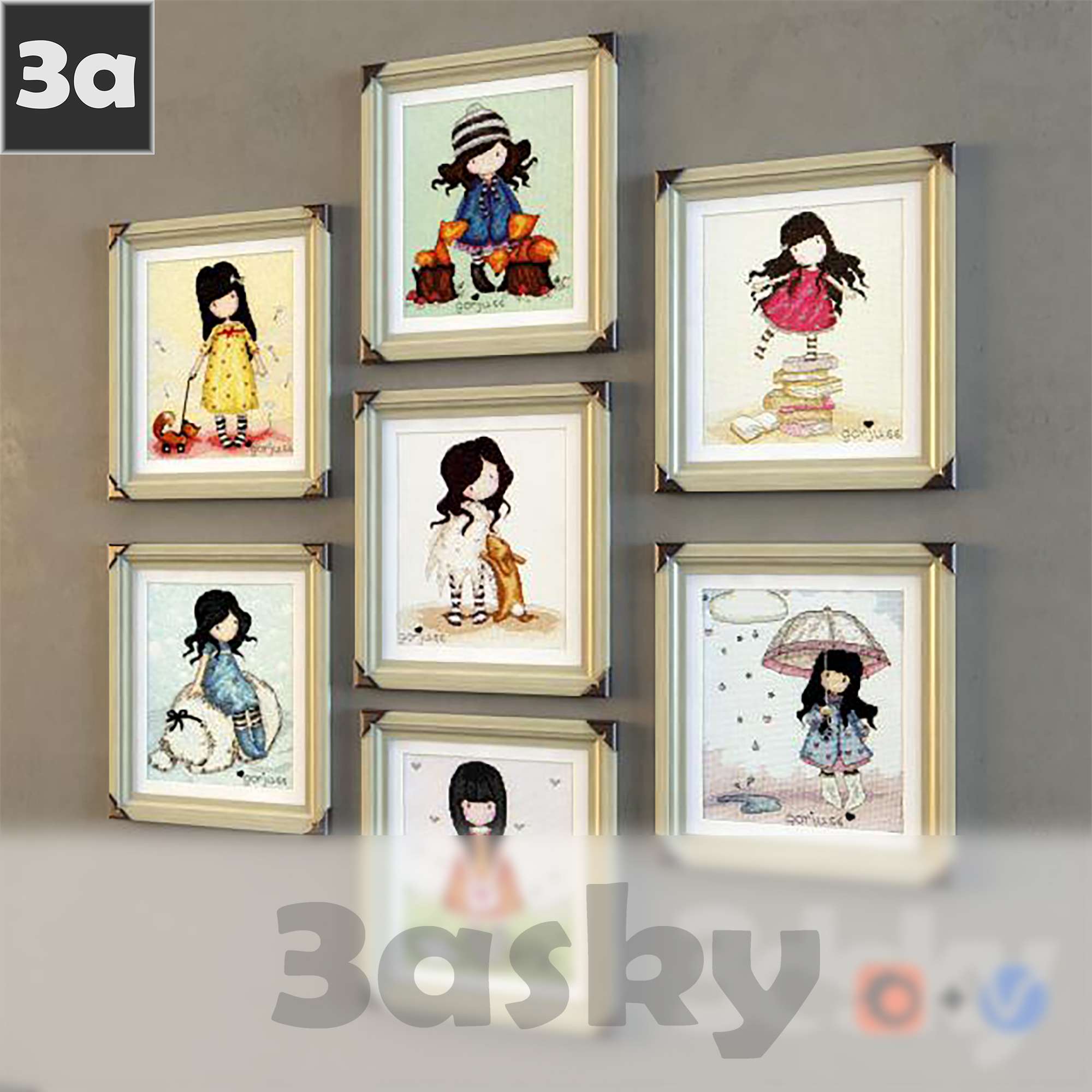 This 3D model showcases a collection of decorative paintings suitable for interior design projects. The high-quality render provides a detailed preview of the artwork, making it a perfect addition to your design library.