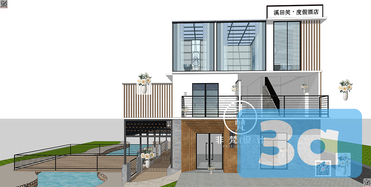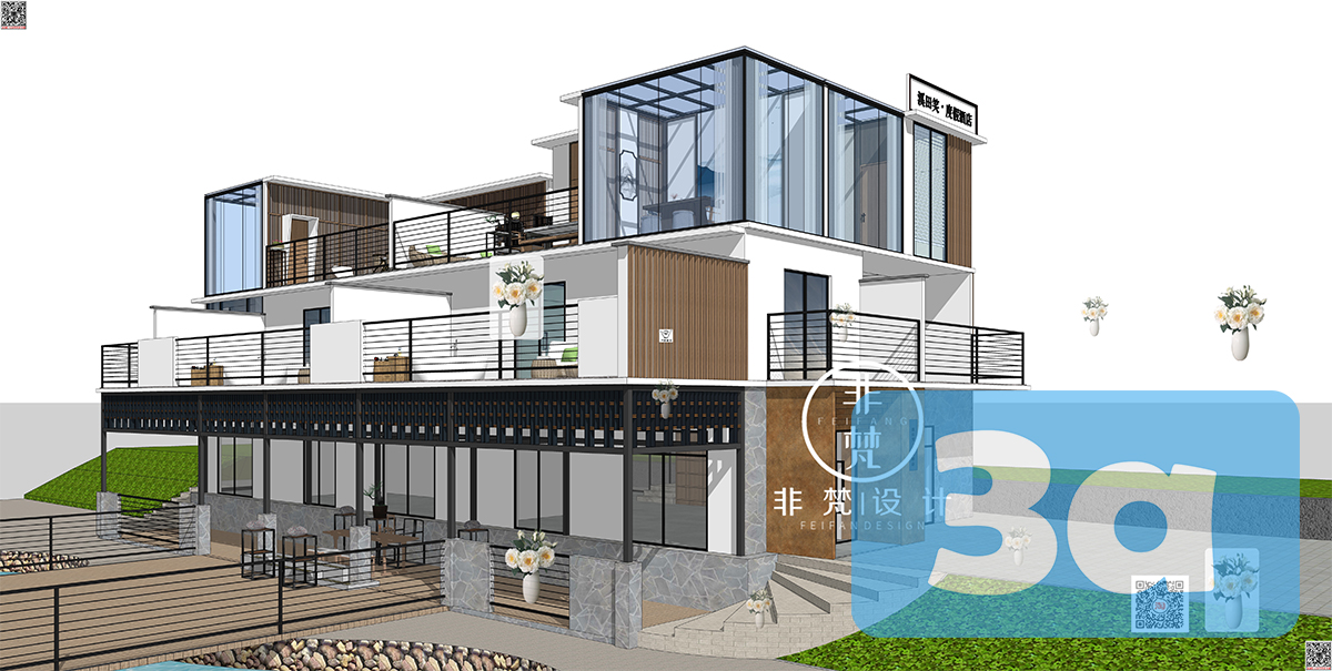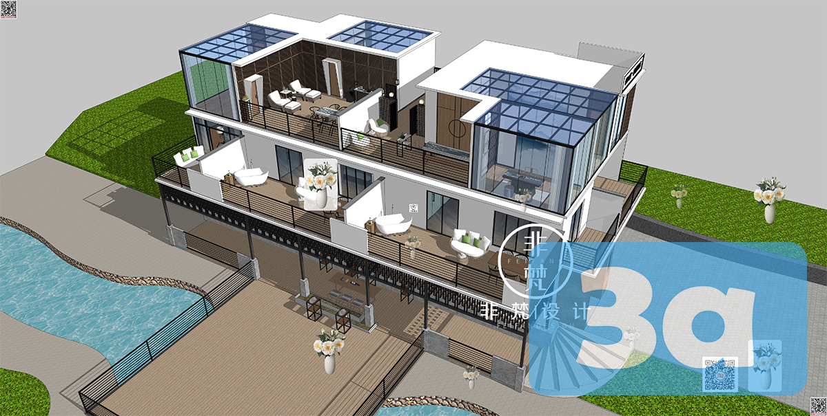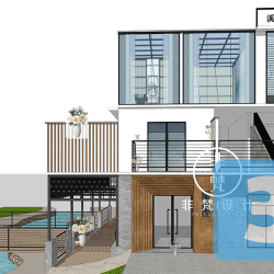 This Sketchup 3D scene showcases an exterior architectural design with intricate details. The model includes elements such as building structures, outdoor landscaping, and lighting features. Explore the creativity and precision in this 3D rendering, perfect for architectural visualization projects.