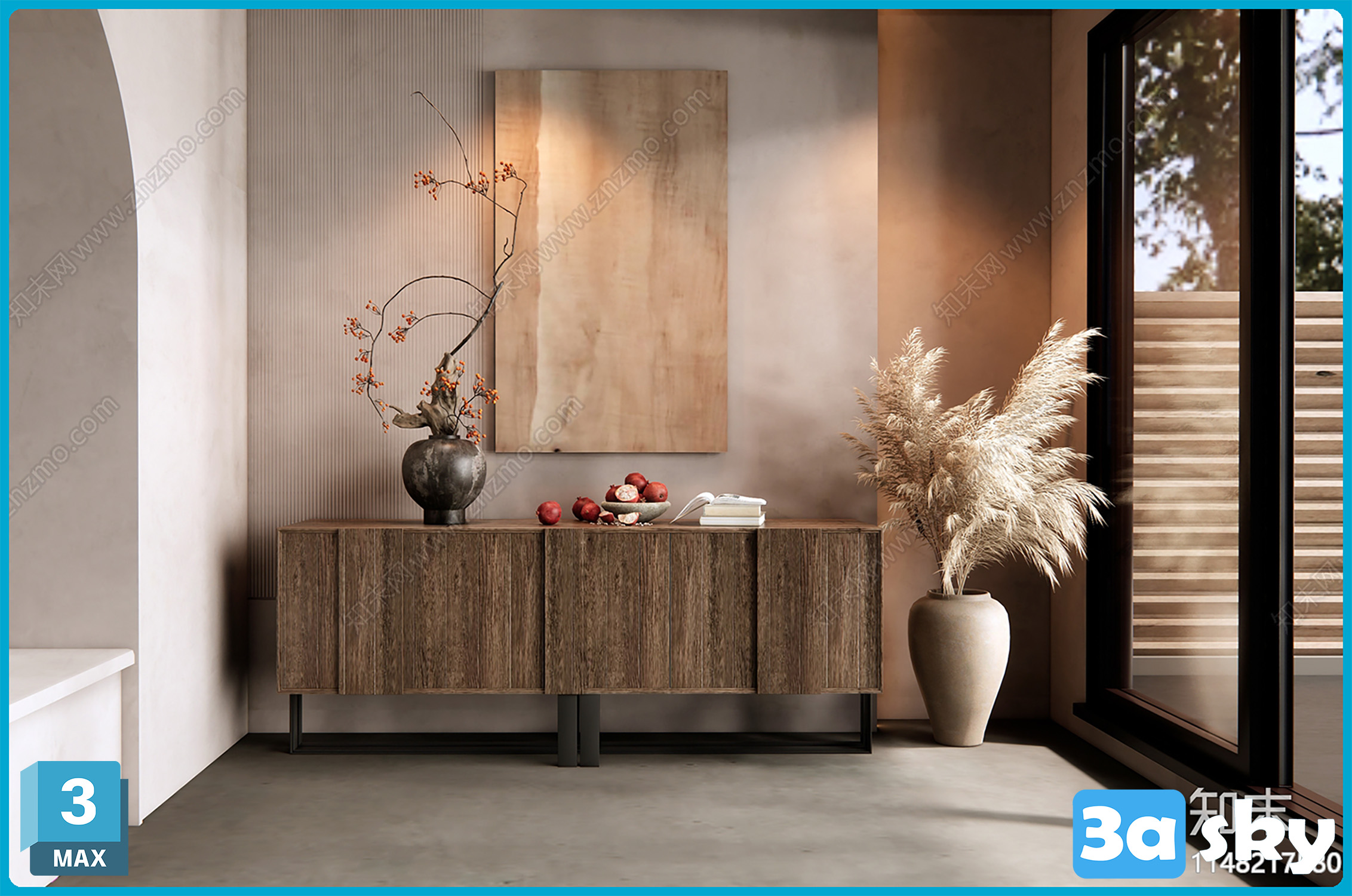 F_VR侘寂风玄关柜_花瓶花艺摆件_芦苇_石榴_挂画_装饰画3D模型ID_1148217580.zip