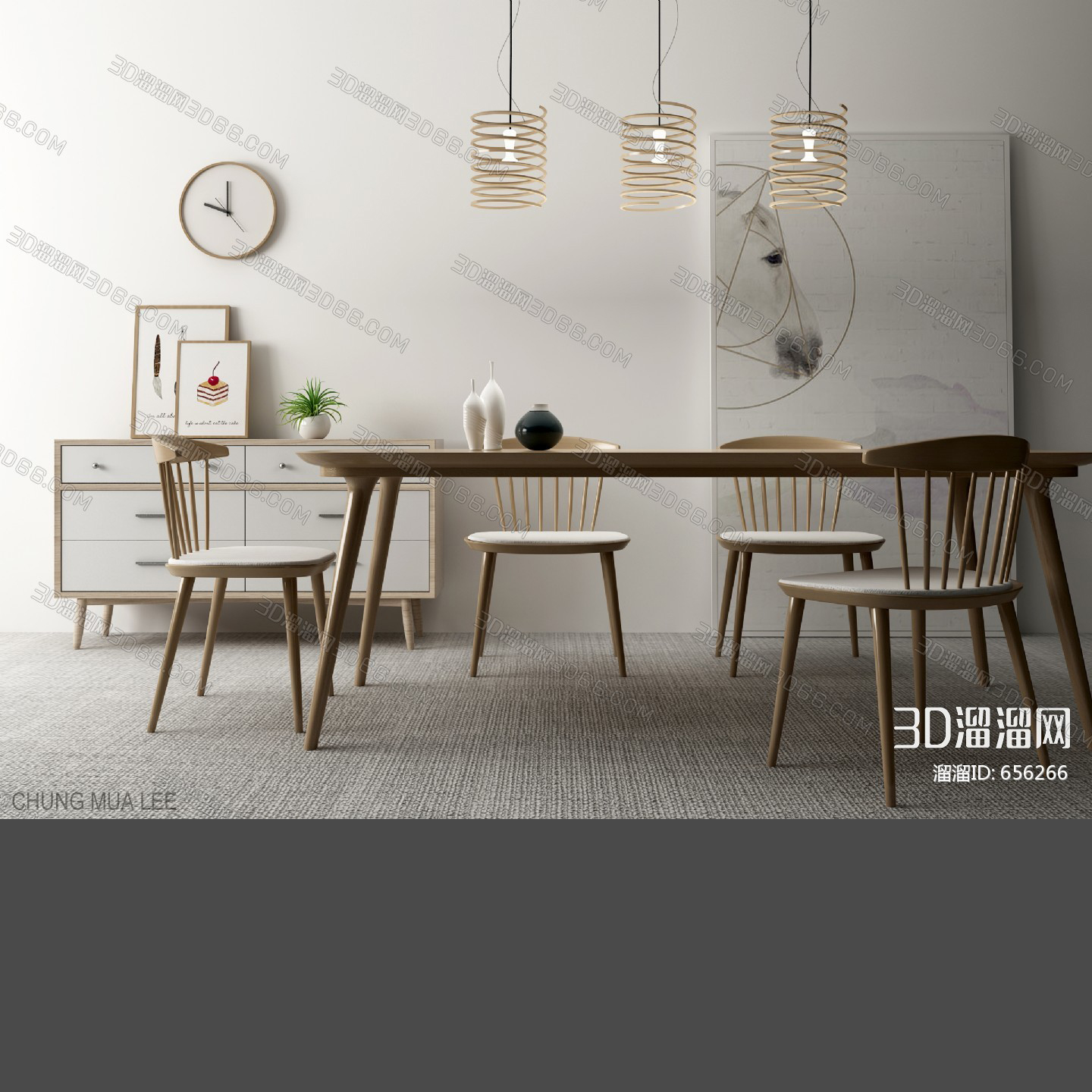 This 3D model showcases a modern and elegant table and chair set, perfect for interior design visualization projects. The set includes a sleek table and matching chairs, designed to add style and functionality to any space. Enhance your design presentations with this high-quality 3D furniture set.
