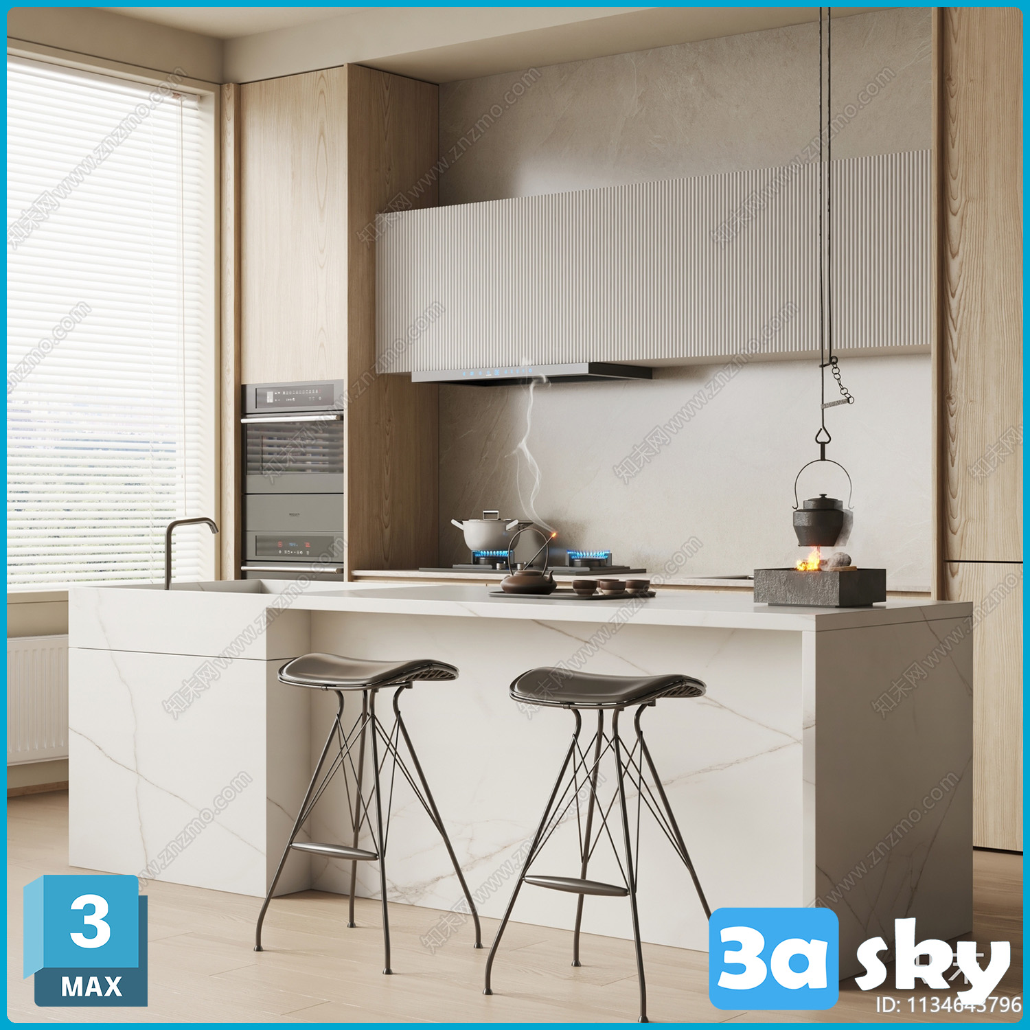 This high-quality image showcases a detailed kitchen model created using 3DS MAX software. The design features modern elements and is ideal for interior design enthusiasts and professionals. Explore this 3D rendering for inspiration and ideas for your next project.