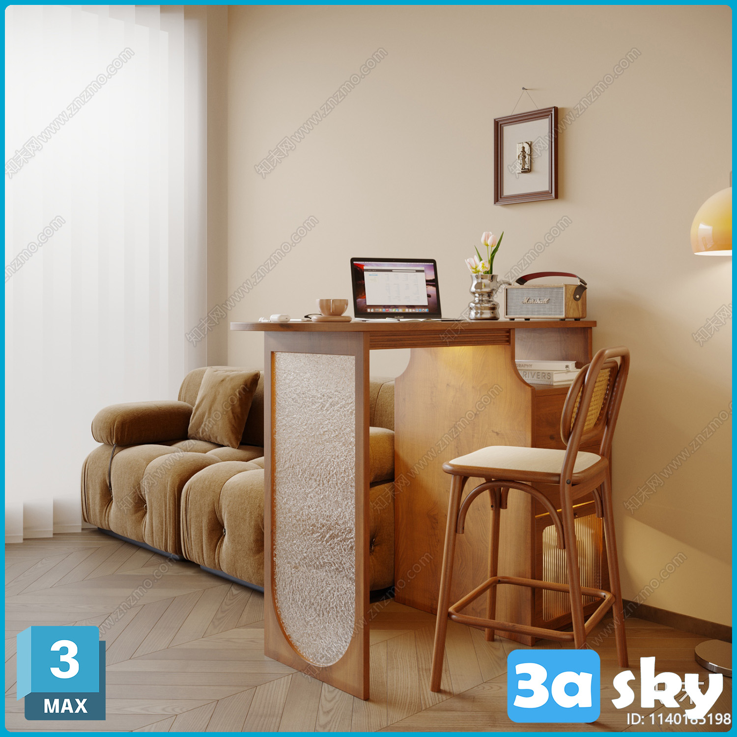 V_CR现代中古风实木吧台吧椅组合_书桌_餐桌_艺术摆件_书籍_挂画_台灯3D模型ID_1140185198.zip