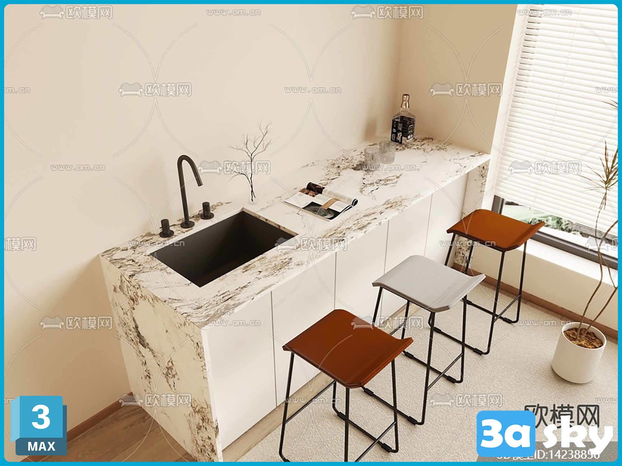 This image showcases a detailed 3D kitchen model created using 3DS MAX software. The design features modern kitchen elements and is ideal for interior design enthusiasts and professionals. The high-quality rendering highlights the intricate details and realistic textures of the kitchen model.