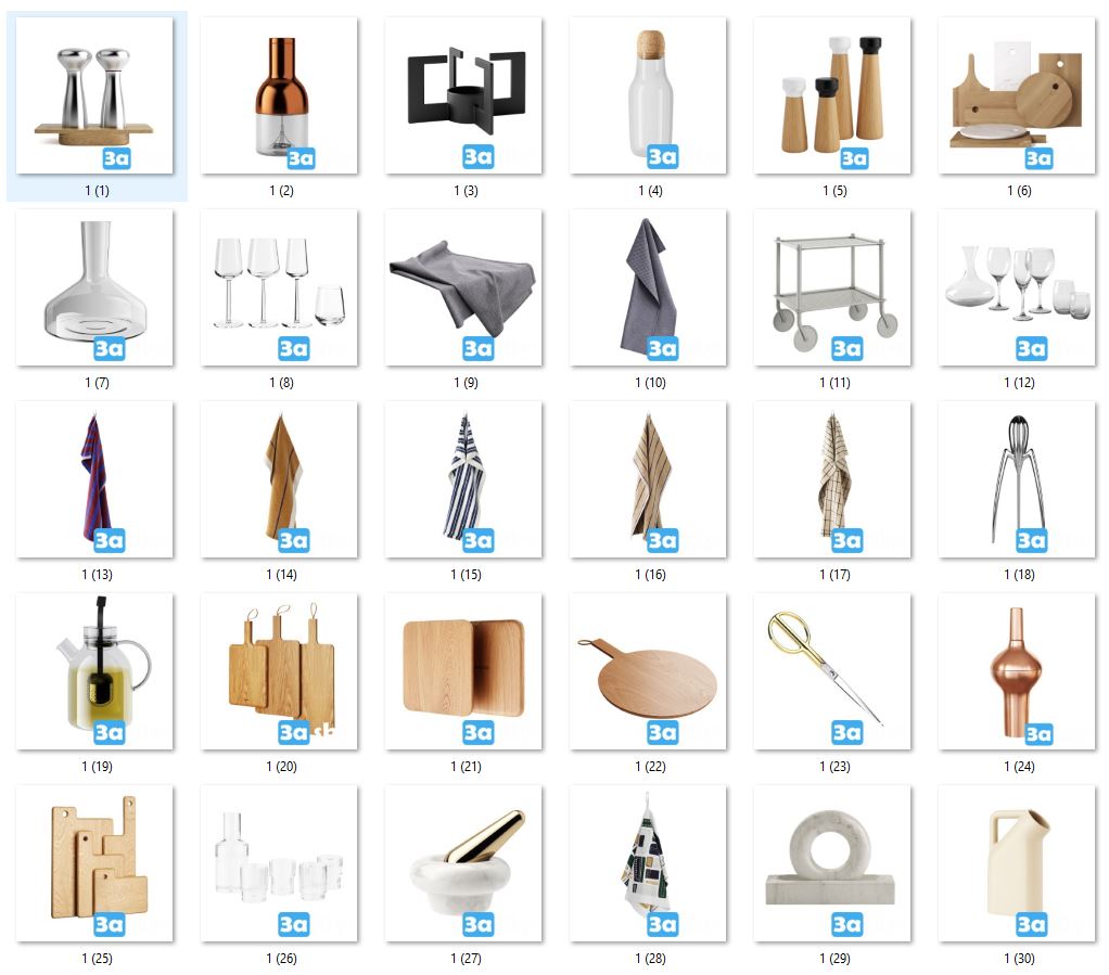 This 3D model features a collection of kitchenware items designed in 3DS MAX. The image showcases various kitchen utensils and tools, perfect for interior design projects or virtual staging. Explore the intricate details and realistic textures of these kitchen items in this high-quality 3D rendering.