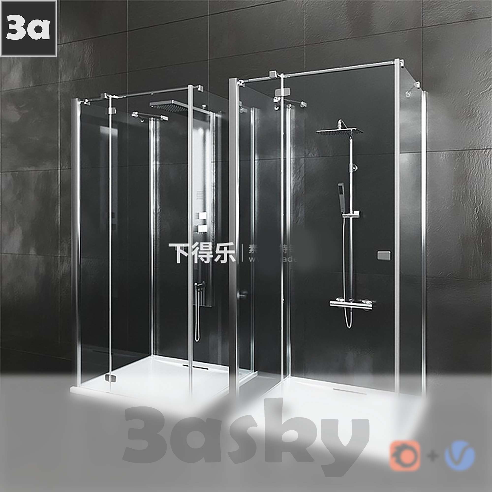 This 3D model showcases a modern bathroom and WC design created using 3DS MAX software. The image features a glass door, contemporary fixtures, and a sleek layout. Explore the intricate details of this interior design concept.