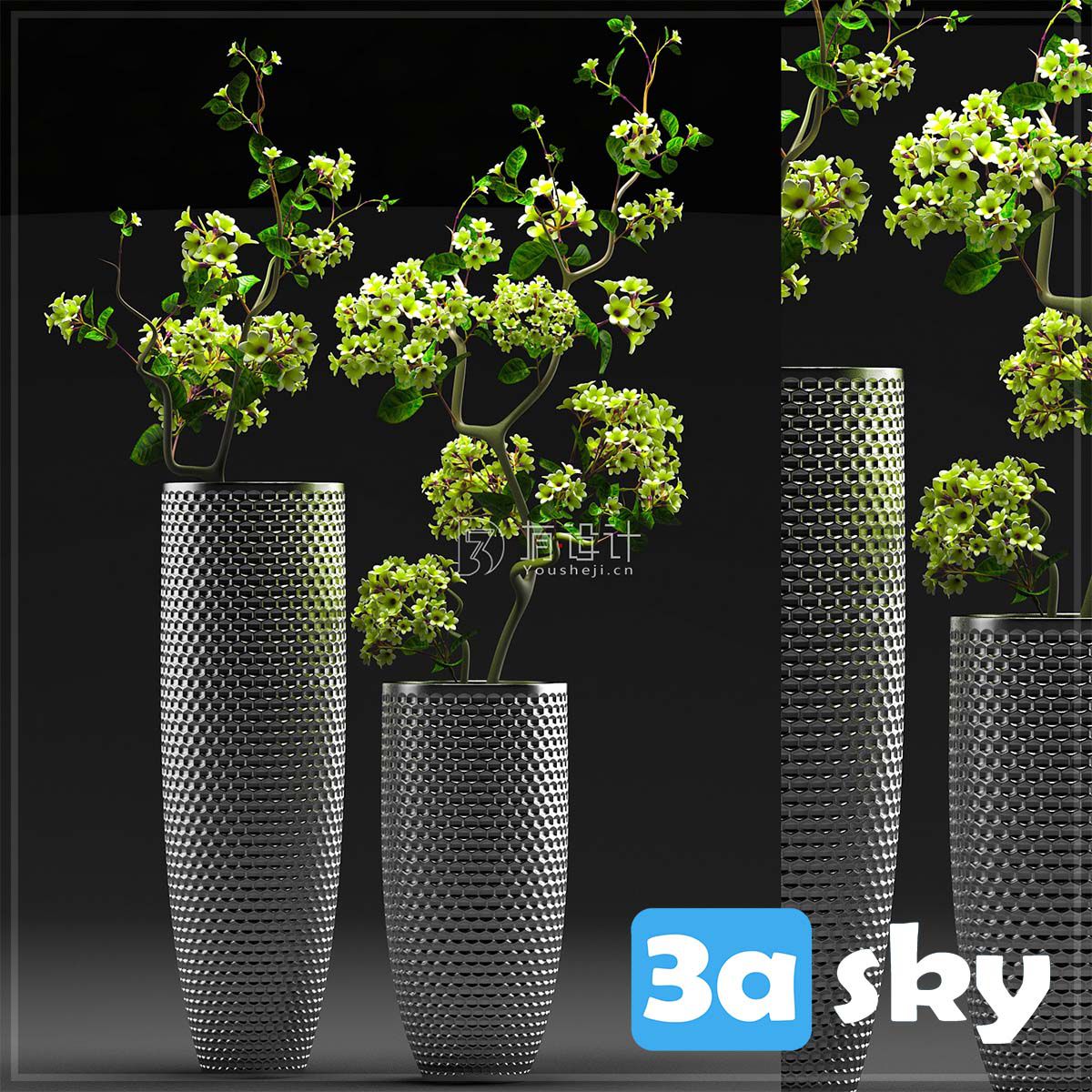 This 3D model file features a collection of detailed flowers in a set. The file is in 3DS MAX format and includes various types of flowers suitable for use in architectural visualization, landscaping, or any other 3D design projects. Enhance your designs with this realistic and high-quality flower set.