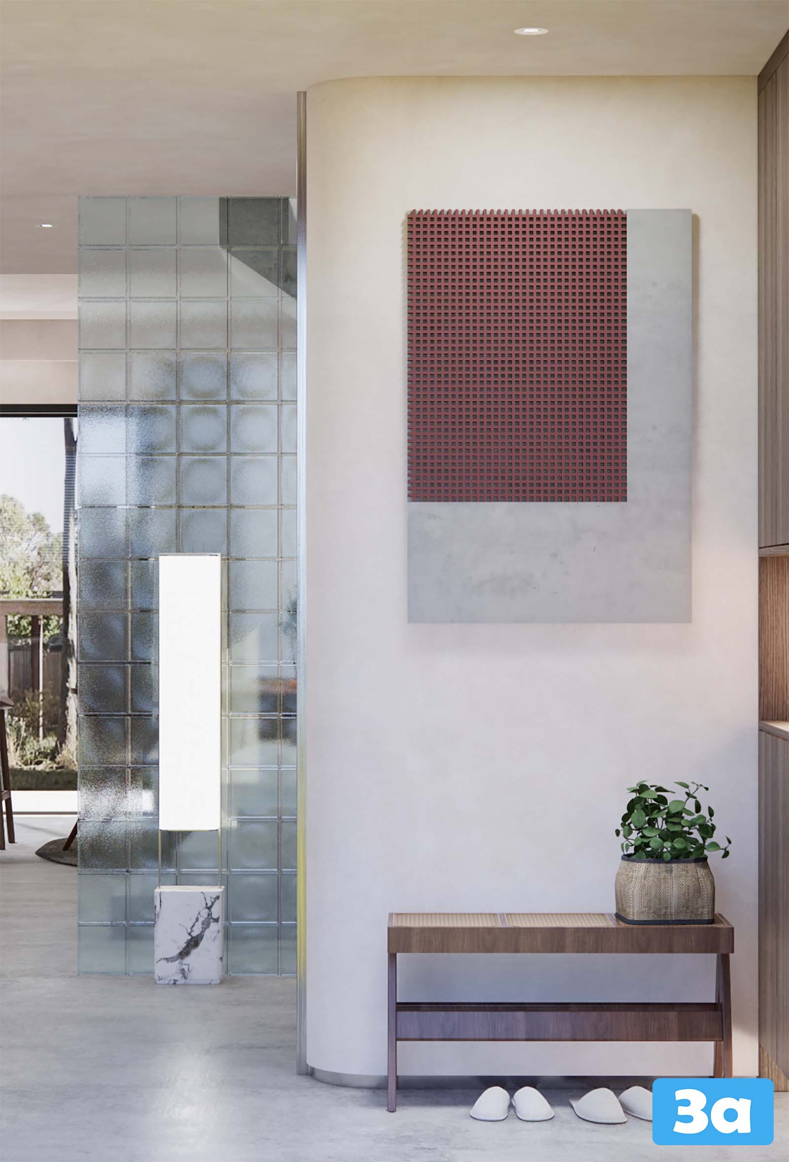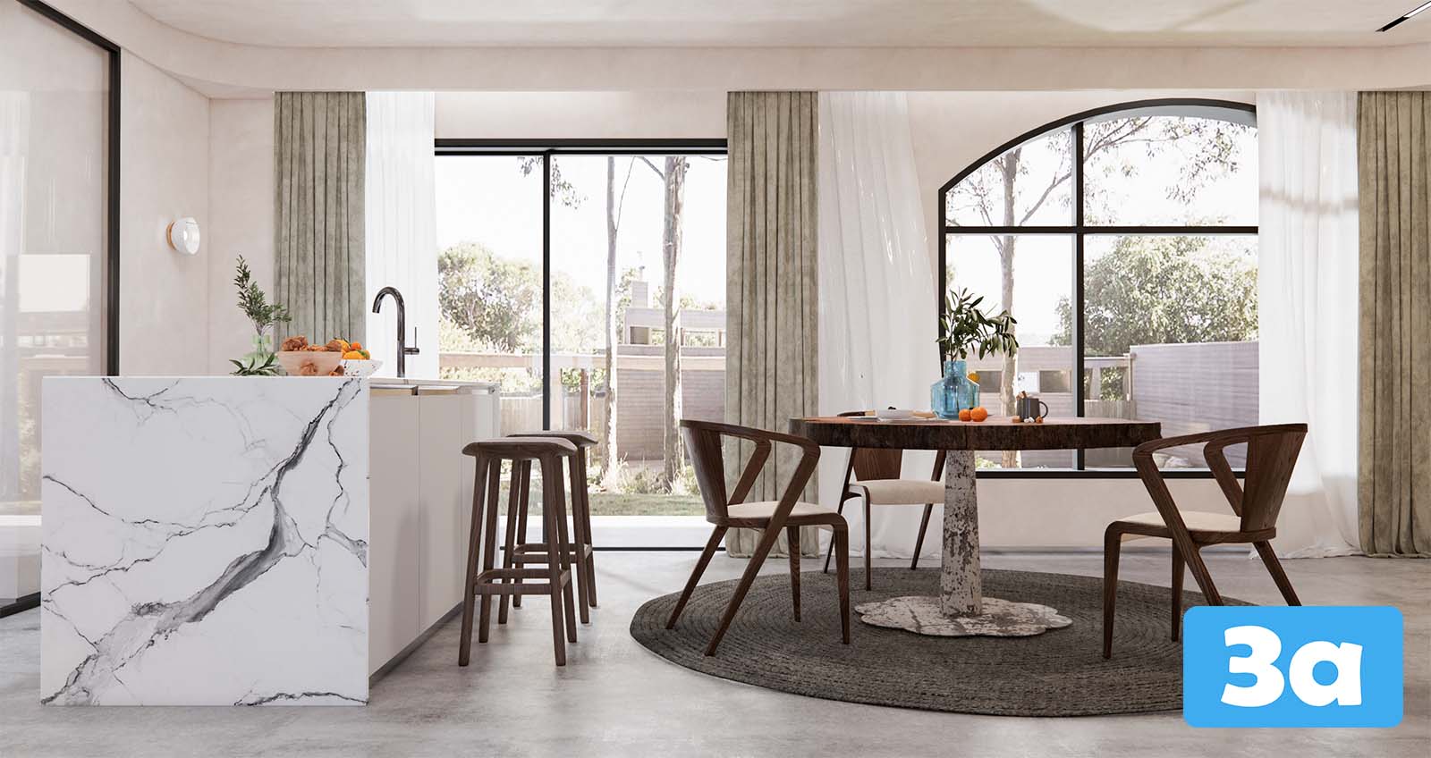 This 3D scene features a beautifully designed dining room with modern furniture and elegant decor. The space is tastefully decorated, creating a warm and inviting atmosphere. Perfect for interior design enthusiasts looking for inspiration.