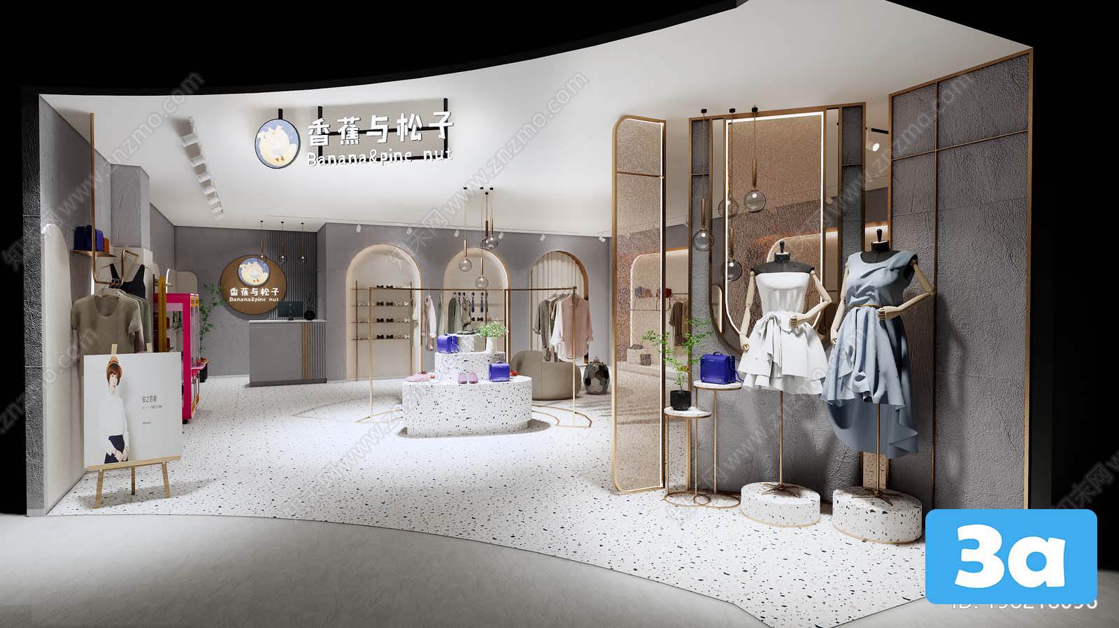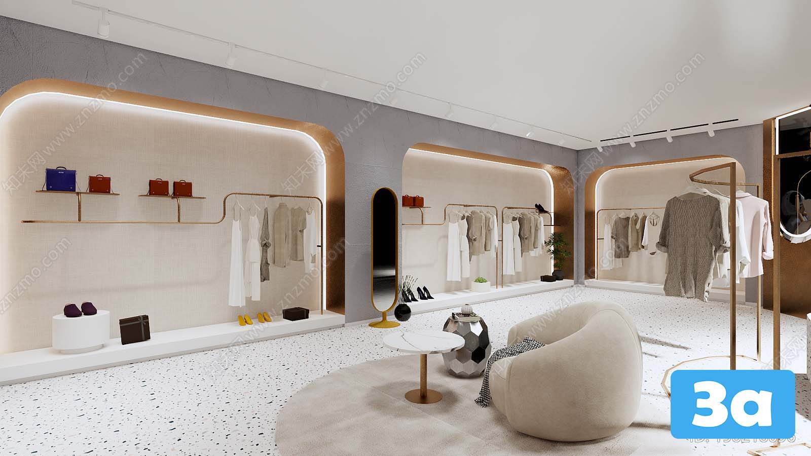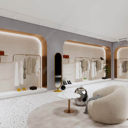 This 3D scene features a beautifully designed interior for fashion shops. The modern and stylish decor creates a welcoming and trendy atmosphere. Explore the layout and details of the space to gather inspiration for your own interior design projects.