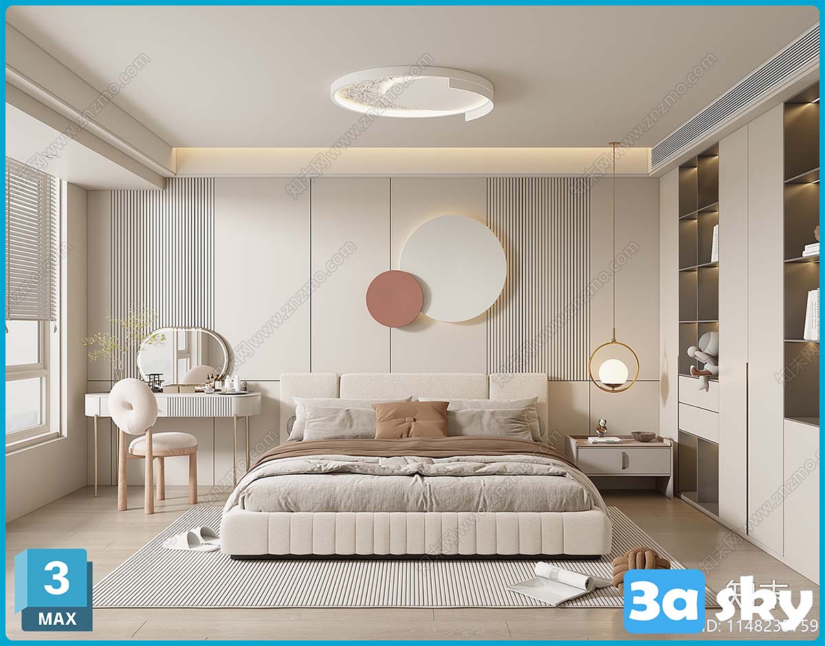 F_VR现代家居卧室_主卧_布艺双人床_梳妆桌椅_衣橱衣柜_床头柜_吸顶灯_墙饰3D模型ID_1148235759.rar