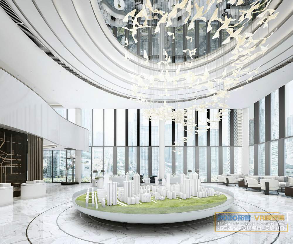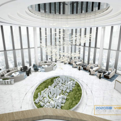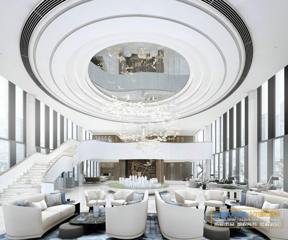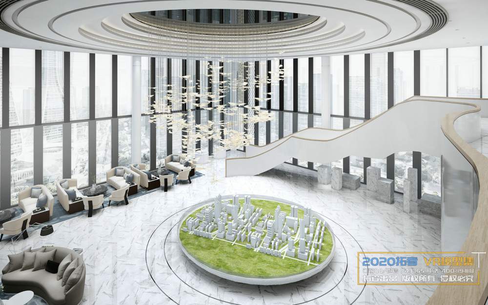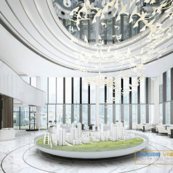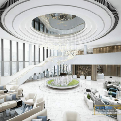 This 3D scene showcases a modern lobby design with a focus on interior architecture and furniture. The scene features contemporary elements and a stylish layout, making it ideal for interior design inspiration and architectural visualization projects.