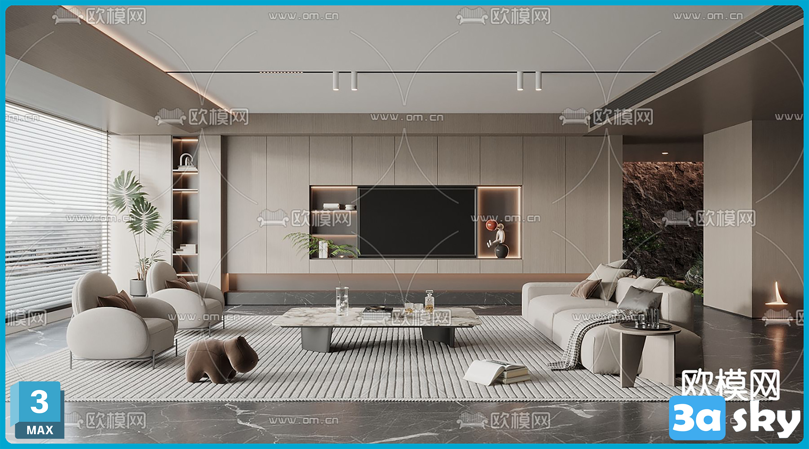This 3D scene model, created in 3DS MAX, features a detailed architectural design with realistic textures. The high quality 3D rendering showcases the intricate details of the interior space, making it ideal for architecture and interior design projects.