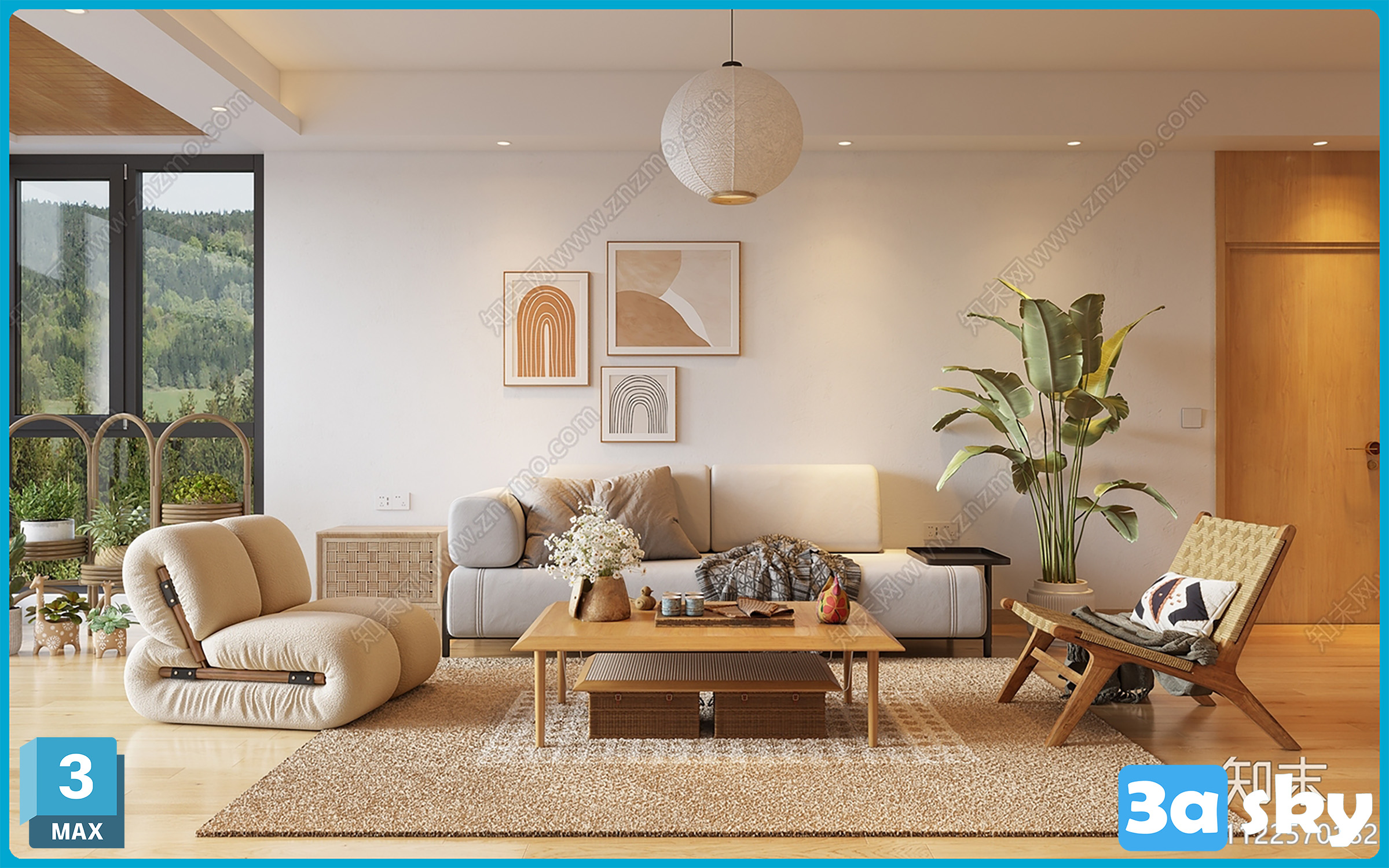 V_现代奶油风客厅_沙发_花架_茶几_摆件_植物_盆栽3D模型ID_1122570182.rar