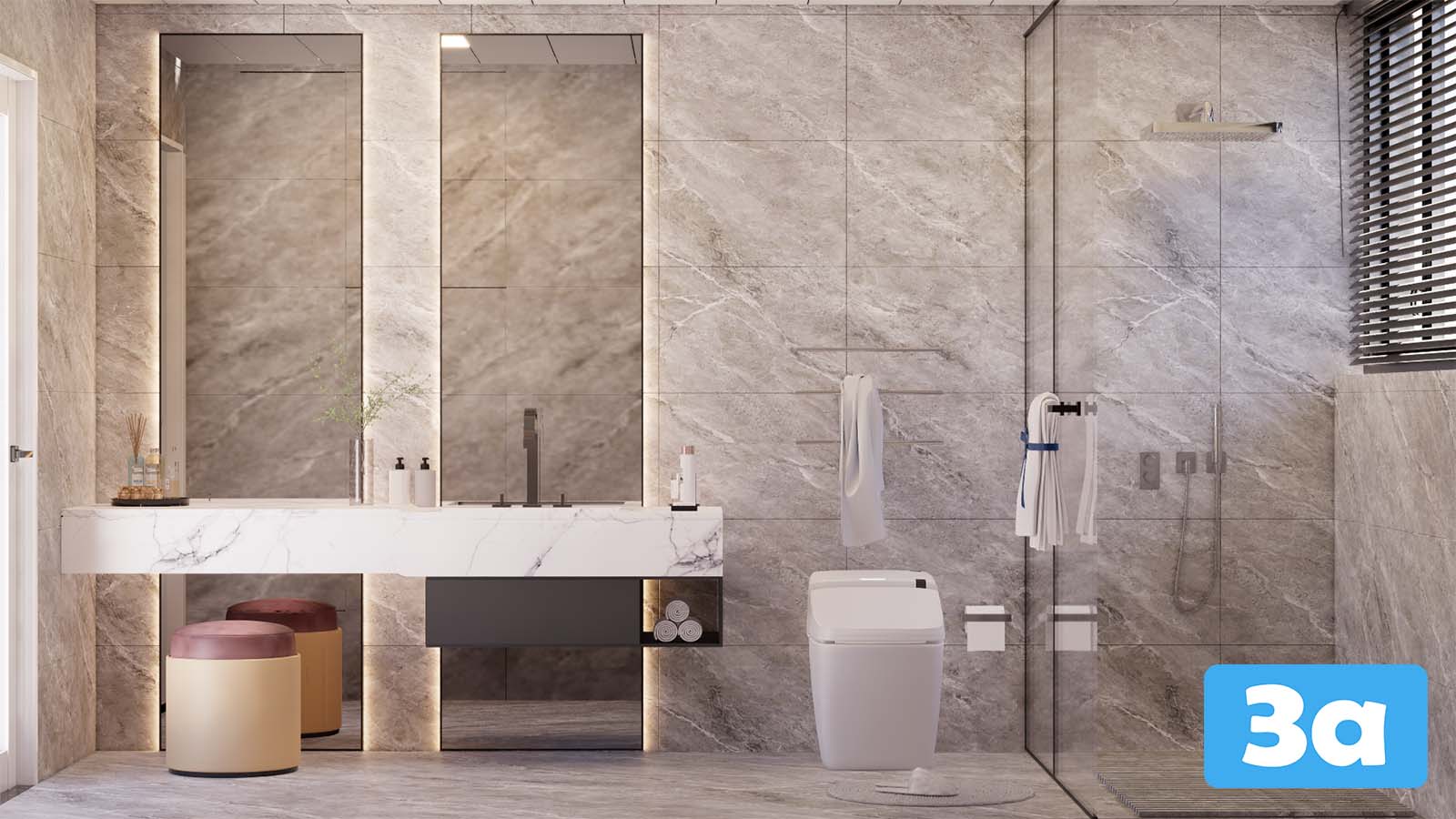 This 3D scene showcases a modern bathroom design with contemporary elements. The layout features a sleek WC area with a focus on clean lines and functionality. Explore this preview to get inspired for your own interior design projects.