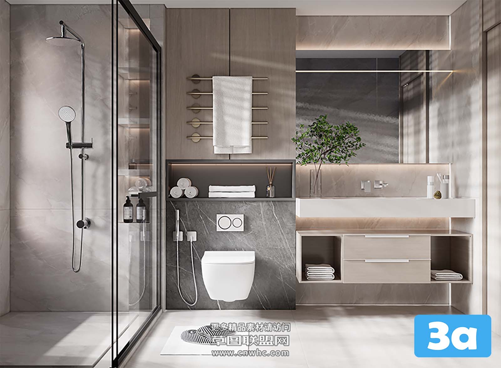 This 3D scene showcases a modern bathroom interior design with contemporary elements. The layout features stylish fixtures and a sleek design, providing inspiration for modern interior design enthusiasts. Explore this preview to get a glimpse of the detailed design and layout of the bathroom space.