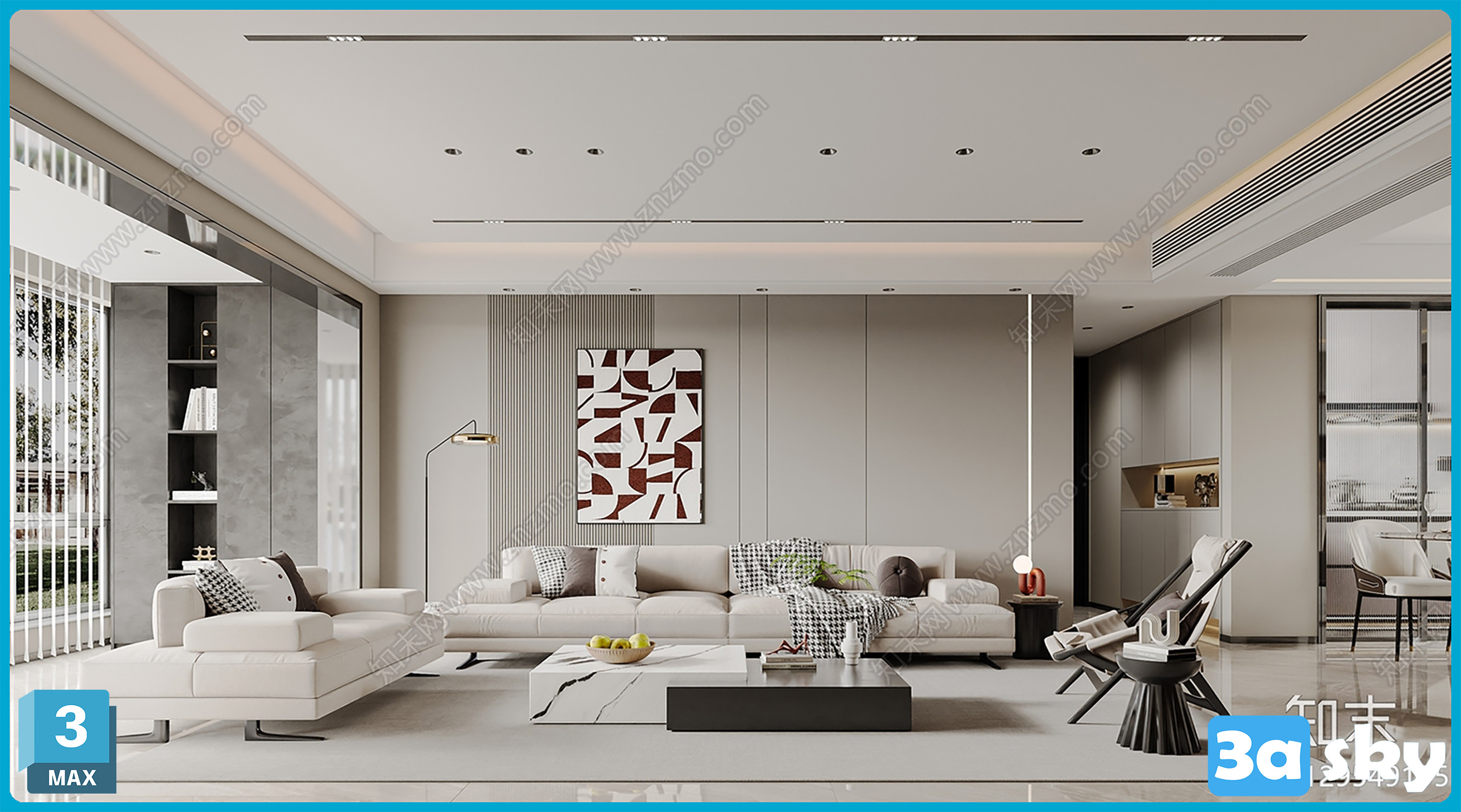 This 3D scene showcases a modern living room with contemporary furniture and decor. The design features a sleek and stylish interior, perfect for those looking for inspiration in modern home decor. The scene is created in 3DS MAX, highlighting the use of textures, lighting, and layout to create a realistic and inviting living space.