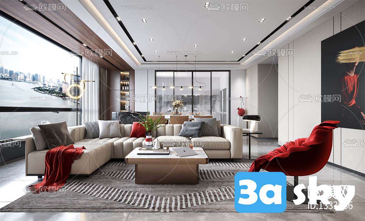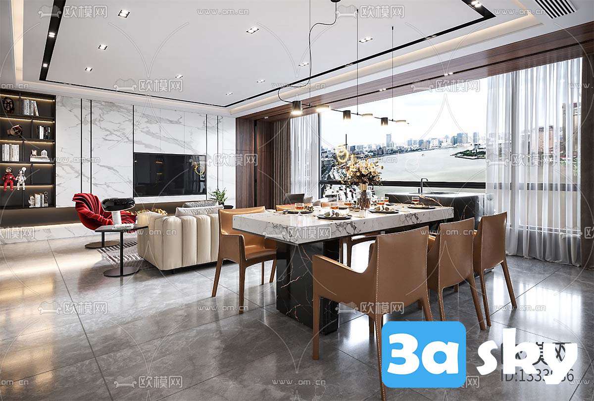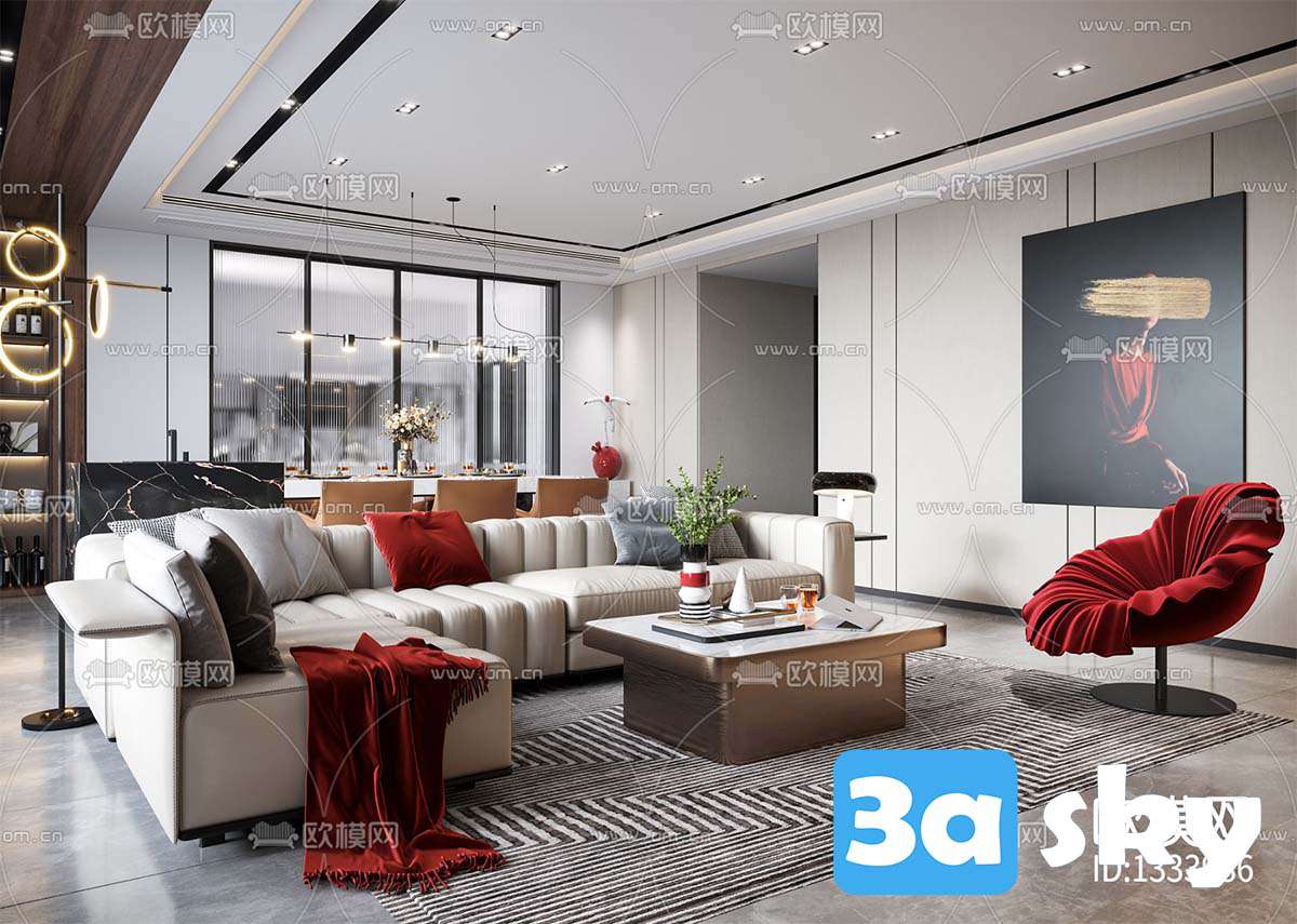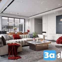 This 3D scene showcases a modern living room interior designed with contemporary elements. The space features sleek furniture, stylish decor, and a harmonious color palette. Explore the intricate details of this 3D model created in 3DS MAX, offering inspiration for interior design enthusiasts and professionals alike.