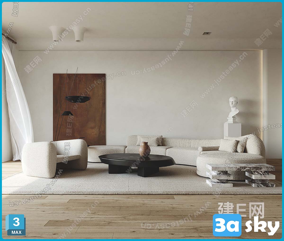 This 3D scene showcases a modern living room interior design with contemporary furniture and decor. The scene is created in 3DS MAX, providing a realistic representation of a stylish and functional living space. Explore the details of the room layout, furniture arrangement, and decor elements in this visually appealing 3D rendering.