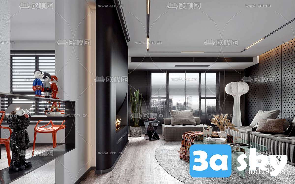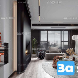 This 3D scene showcases a modern living room interior designed with a contemporary aesthetic. The space features stylish furniture, elegant decor, and a harmonious color palette. Created using 3DS MAX, this scene offers a glimpse into modern interior design trends.