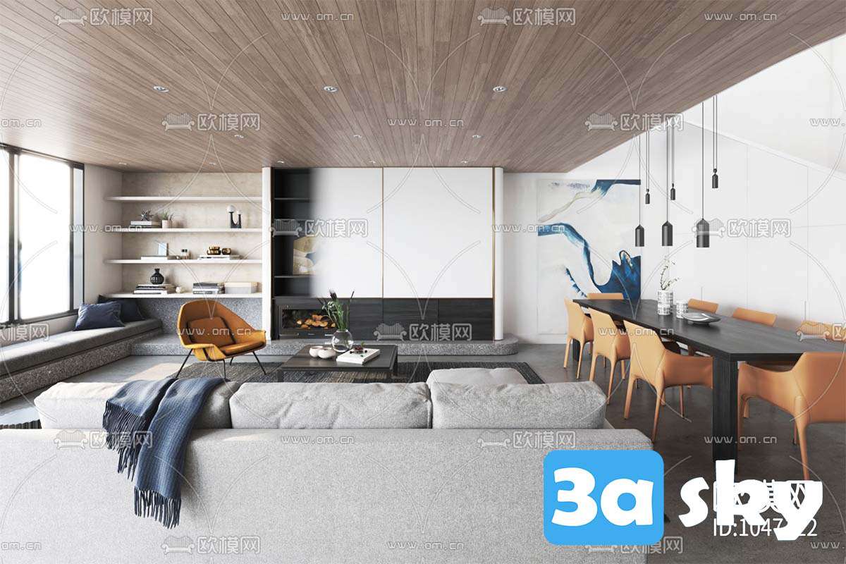 This 3D scene showcases a modern living room interior designed with contemporary elements. The space features sleek furniture, stylish decor, and a harmonious color palette. Experience the essence of modern living through this visually appealing 3D rendering.