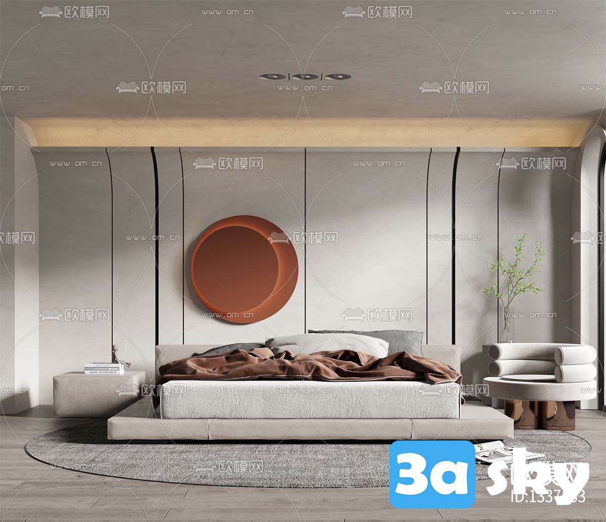 This 3D scene showcases a modern living room interior designed with a contemporary style. The scene includes stylish furniture, decor elements, and a well-thought-out layout. Explore the intricate details and design choices in this visually appealing 3D rendering.