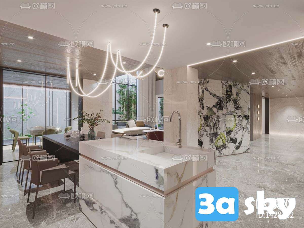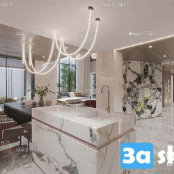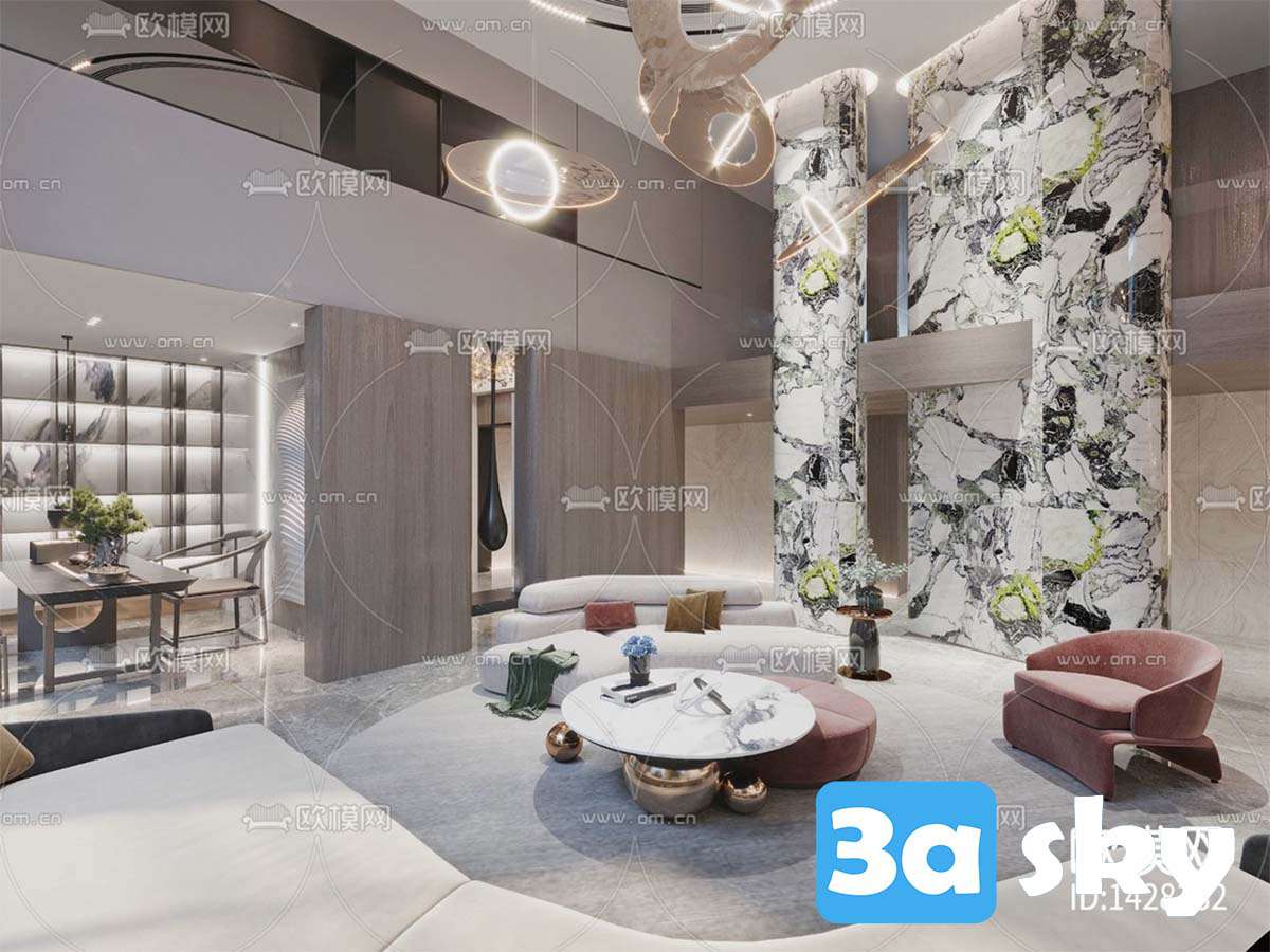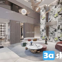This 3D scene showcases a modern living room interior with sleek furniture, elegant decor, and a sophisticated color palette. The design highlights contemporary architecture and interior design trends, offering a glimpse into a stylish and functional living space.