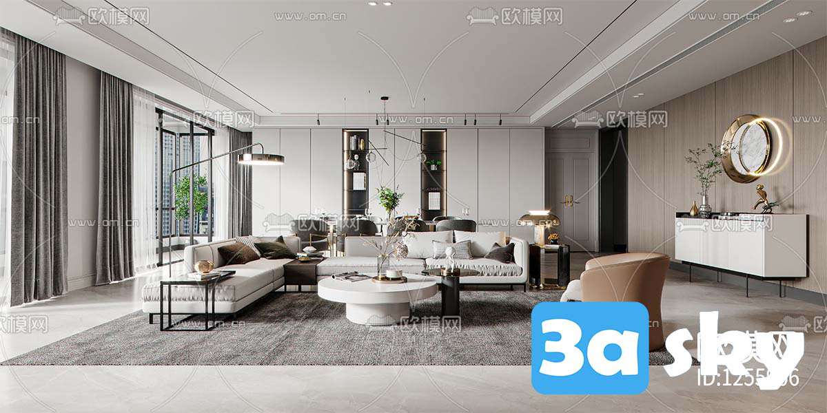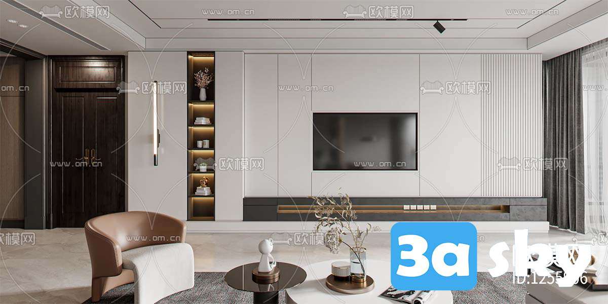 This 3D scene showcases a modern living room interior designed with a focus on contemporary architecture and interior design. The scene features sleek furniture, elegant decor, and a harmonious color palette, creating a welcoming and stylish space. Explore the details and craftsmanship of this 3D scene to inspire your own interior design projects.