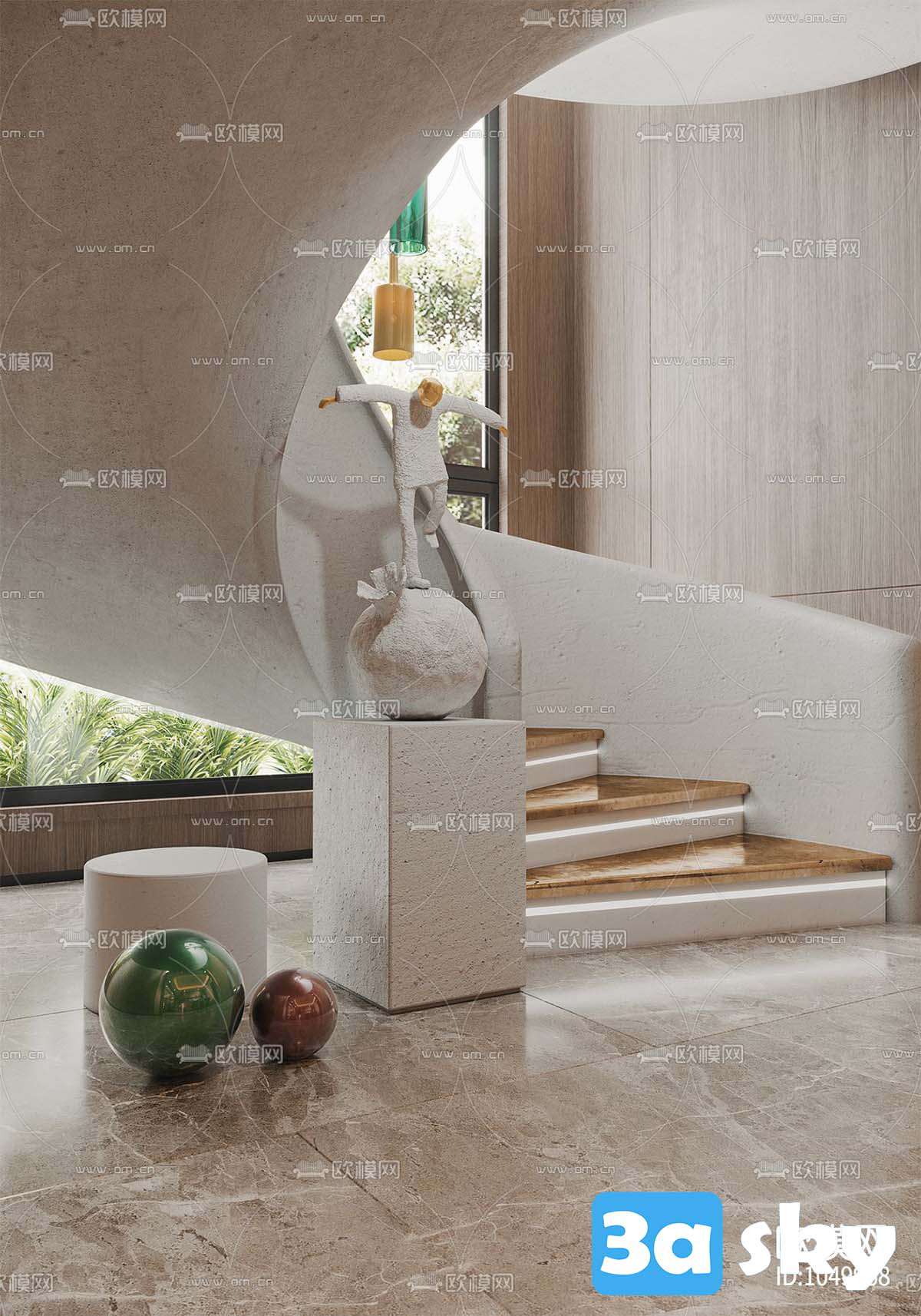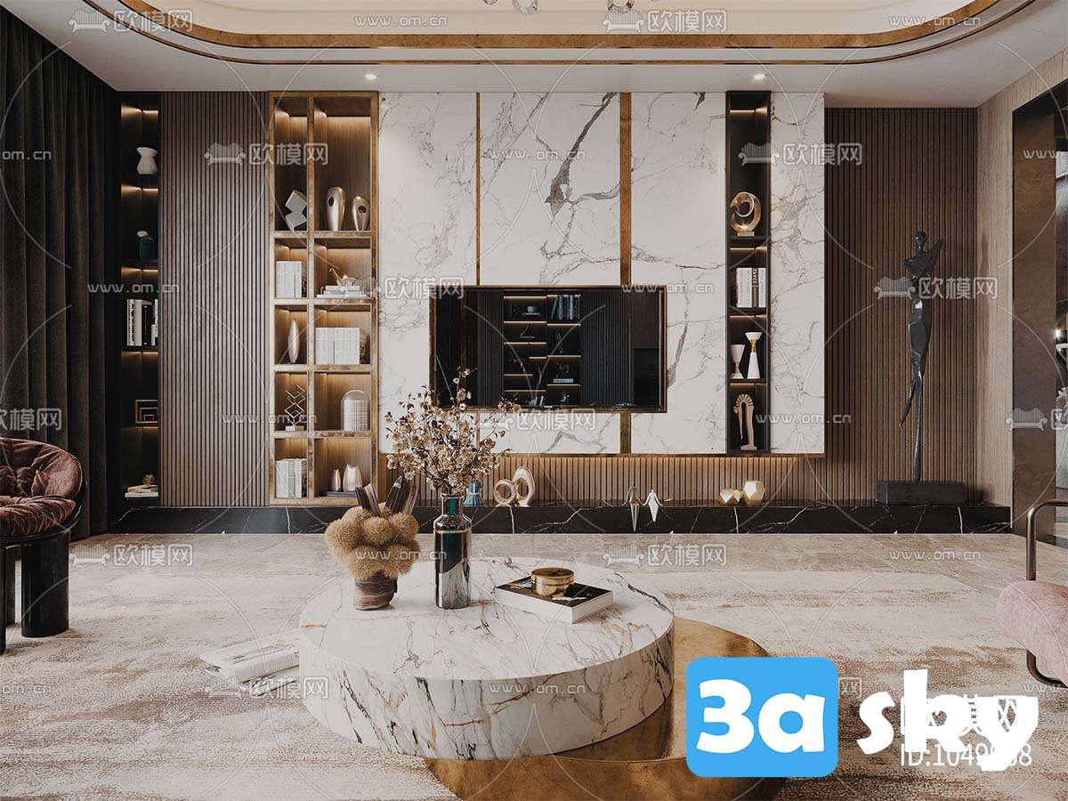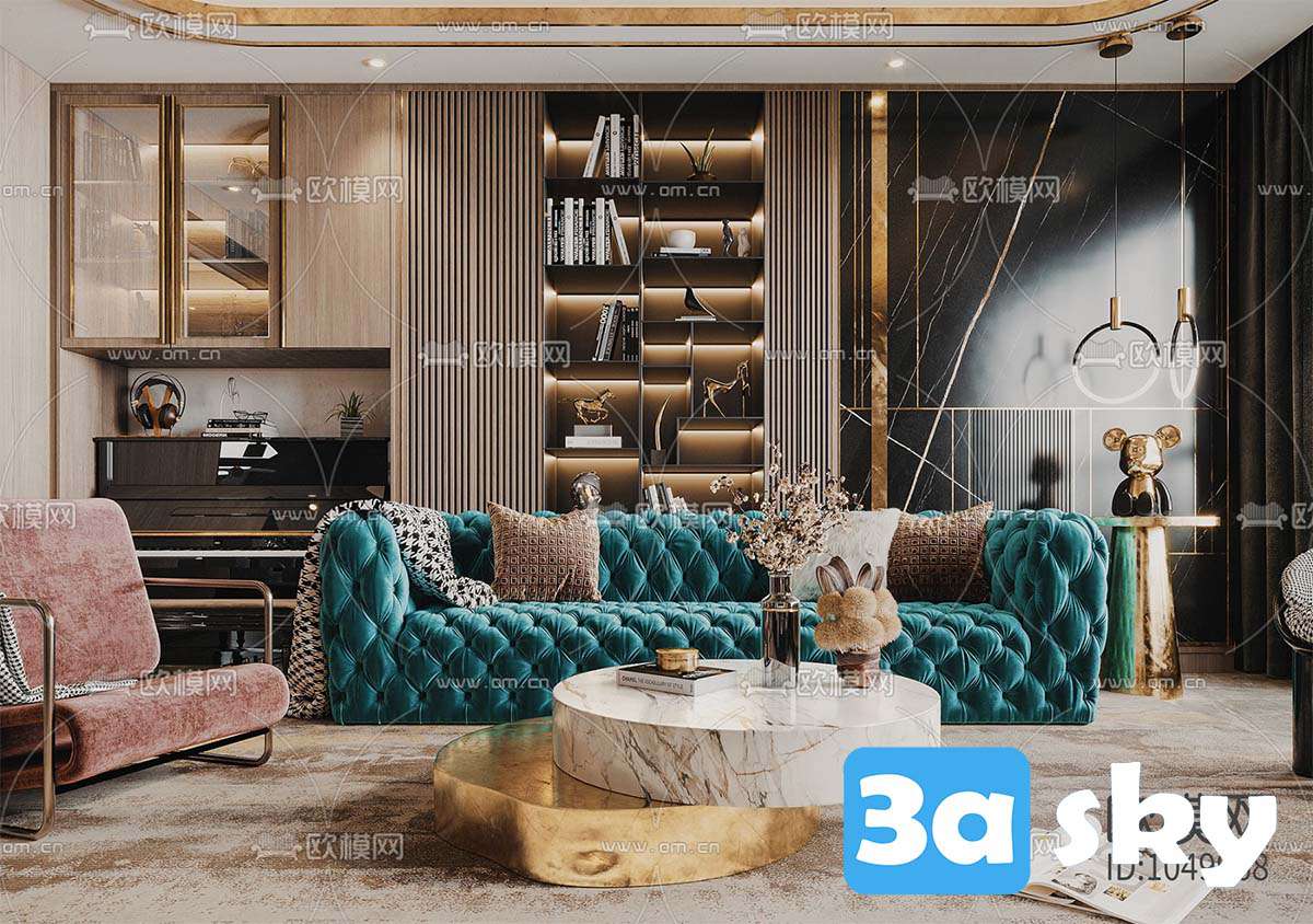 This 3D scene showcases a modern living room interior with carefully selected furniture and decor elements. The design features a contemporary style with a focus on comfort and aesthetics. Explore the layout, lighting, and overall ambiance of this 3D model to inspire your own interior design projects.