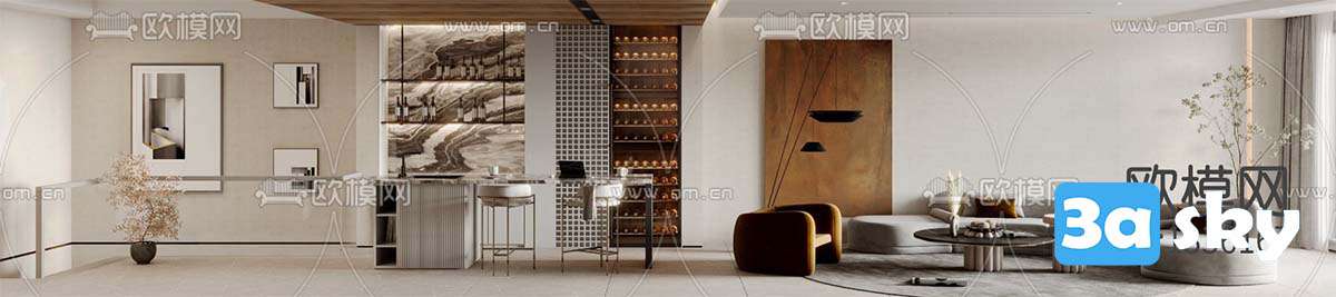This 3D scene showcases a modern living room interior with contemporary furniture and design elements. The scene is created in 3DS MAX, providing a realistic and detailed representation of a stylish living space. Explore the intricate details and layout of this modern interior design.