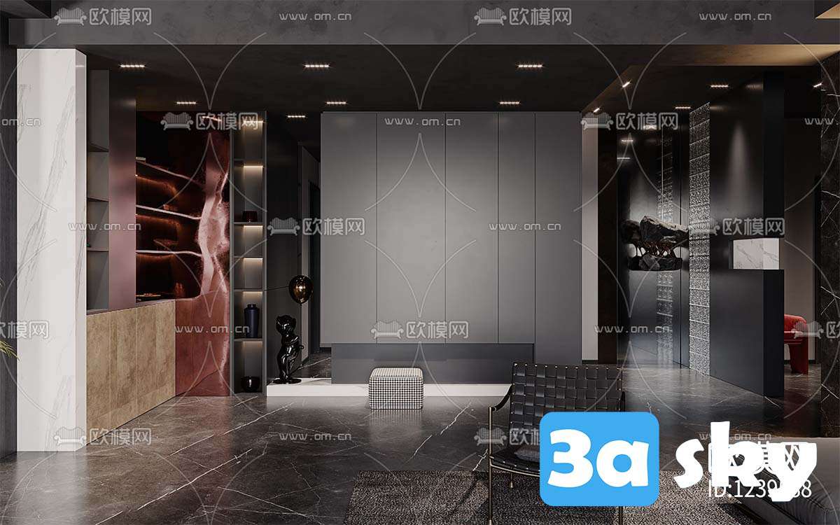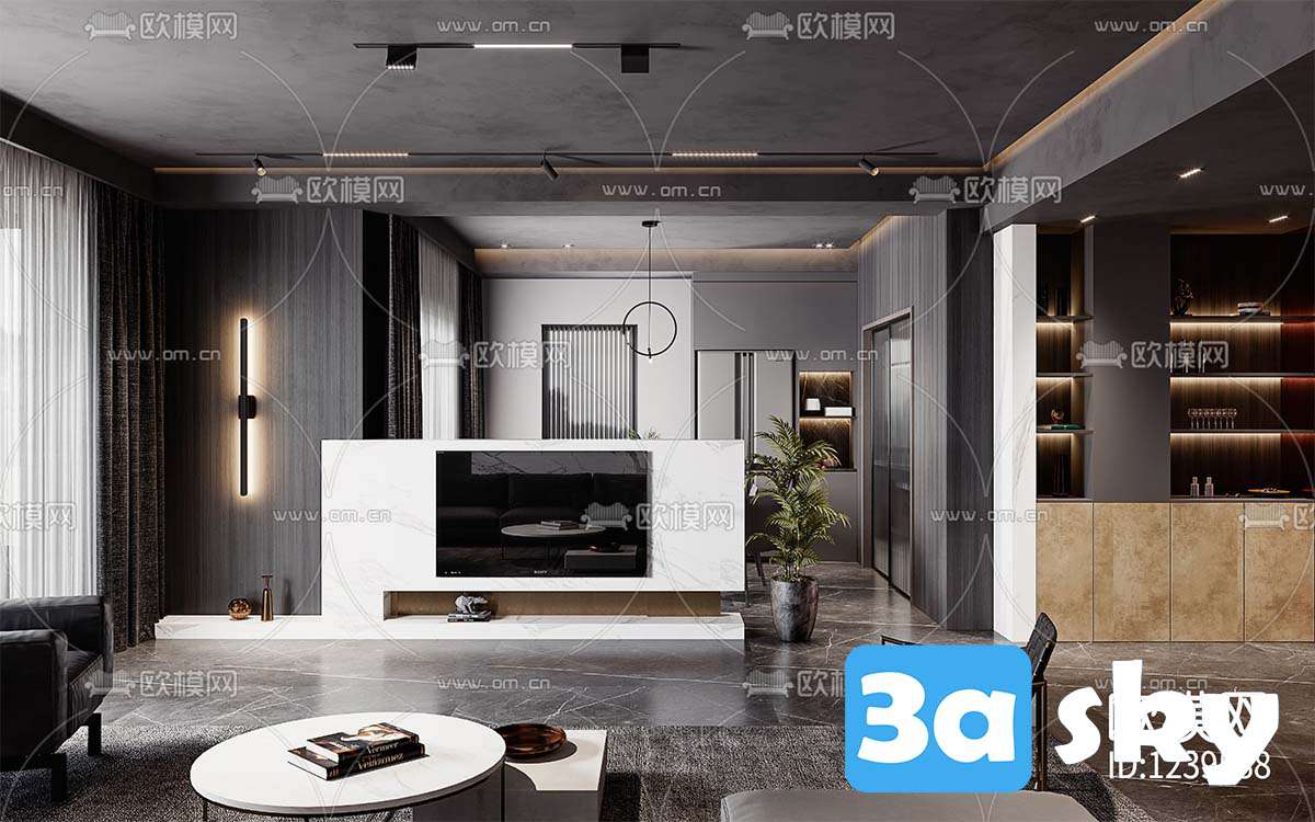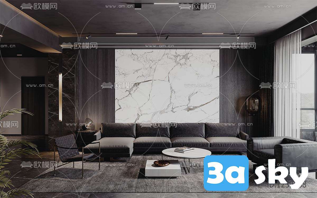 This 3D scene features a modern living room interior design with contemporary furniture and decor elements. The space is elegantly designed with a focus on comfort and style. Explore the details and get inspired for your own interior design projects.