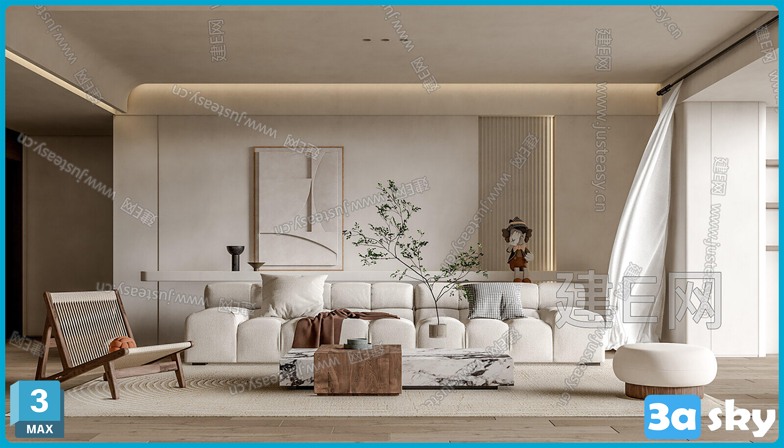 This 3D scene showcases a modern living room interior design with contemporary furniture and a stylish layout. The room features a comfortable sofa, elegant coffee table, and chic decor elements. The color scheme is neutral with pops of color for a vibrant touch. Experience the beauty of modern interior design in this captivating 3D scene.