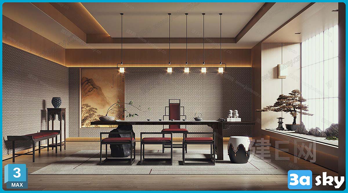 This 3D scene showcases a modern living room interior design with contemporary furniture and decor. The room features a stylish sofa, coffee table, and decorative elements. Perfect for those seeking inspiration for their own interior design projects.