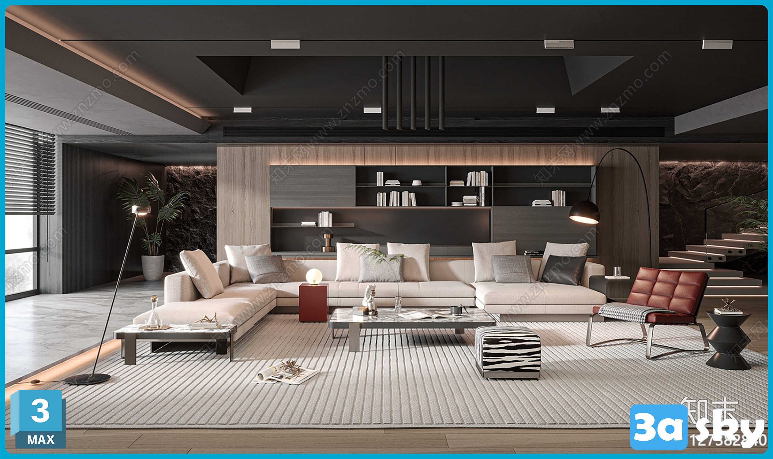 This 3D scene showcases a modern living room interior design with carefully selected furniture and decor items. The space exudes a contemporary vibe with its clean lines, neutral color palette, and stylish accents. Step into this virtual room to experience the perfect blend of aesthetics and functionality.