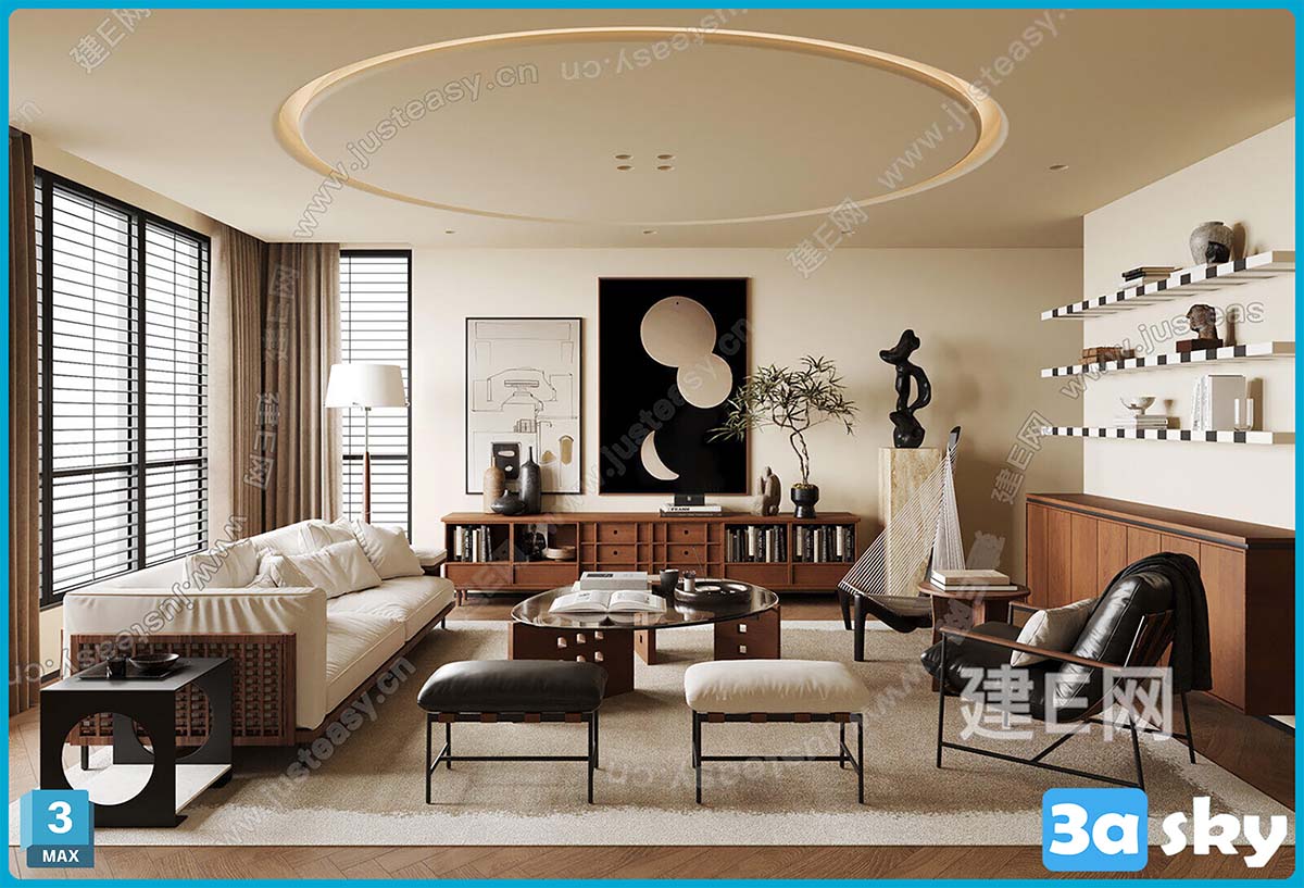 This 3D scene showcases a modern living room interior design with contemporary furniture and decor. The room features a stylish sofa, coffee table, and decorative elements. The color scheme is neutral with pops of color for a vibrant touch. Perfect for those seeking inspiration for their own interior design projects.