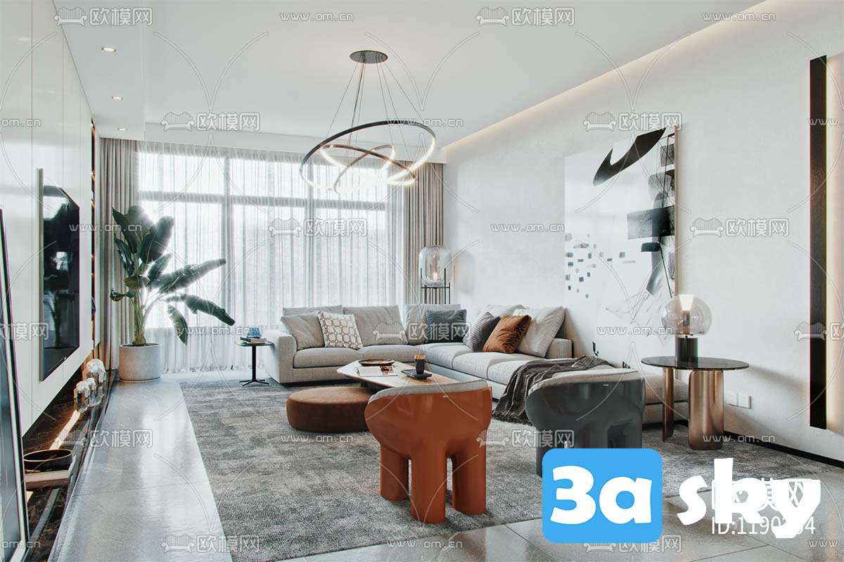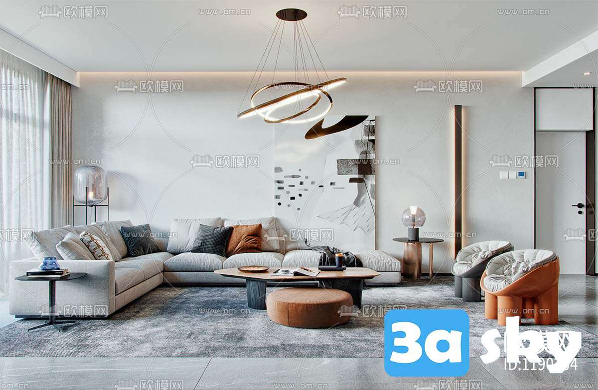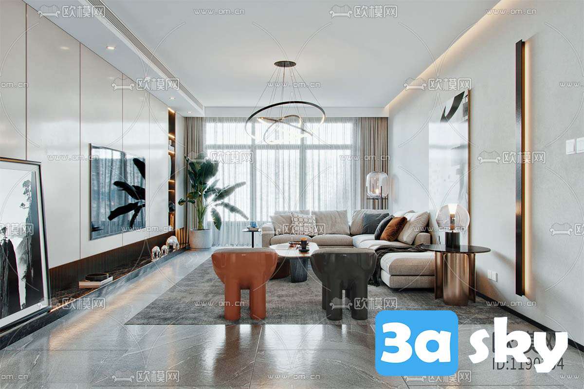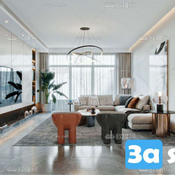 This 3D scene features a beautifully designed modern living room interior. The space is elegantly furnished with contemporary furniture pieces and stylish decor elements. The color scheme is neutral with pops of color adding a vibrant touch. Perfect for those seeking inspiration for their own interior design projects.