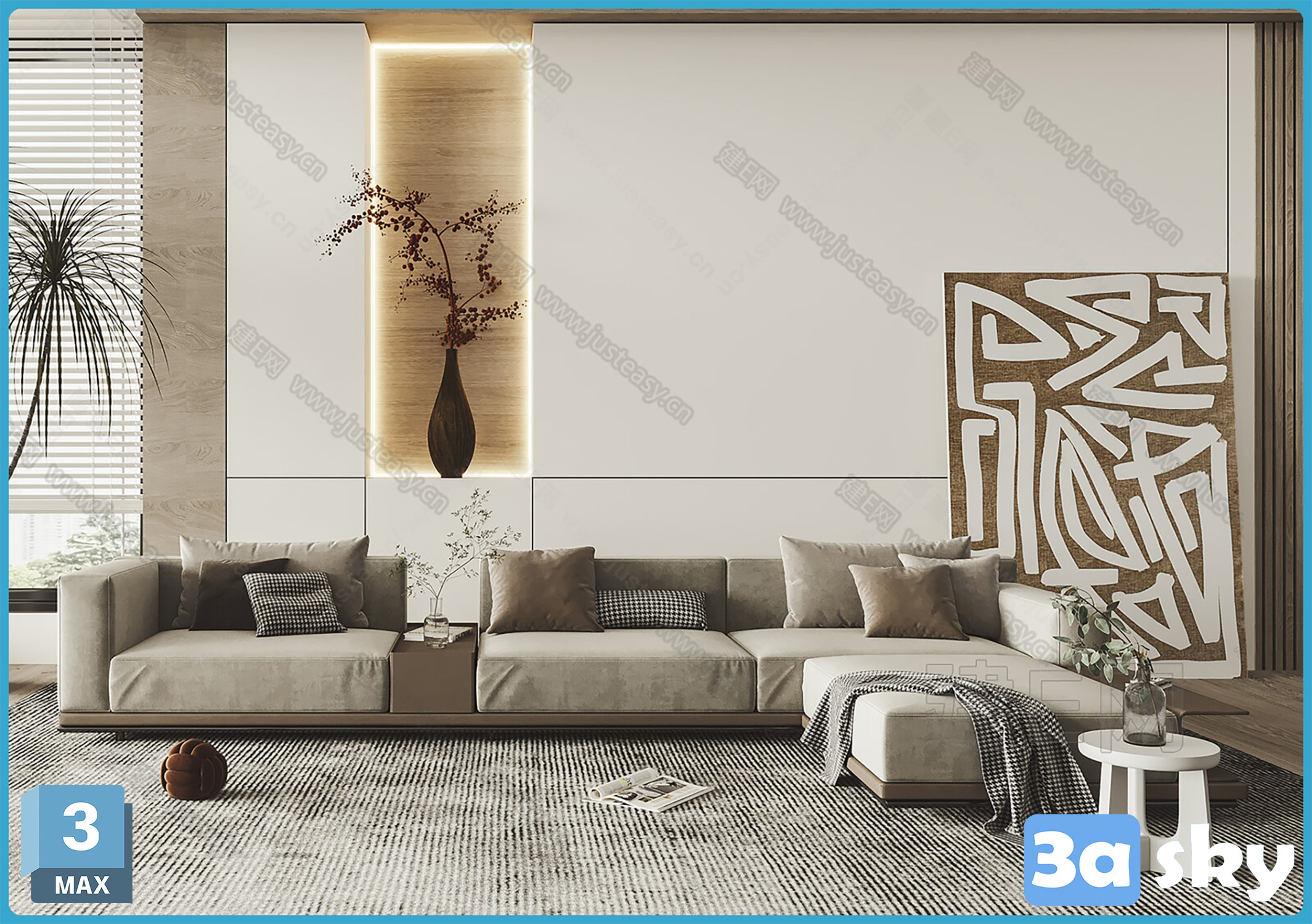 This 3D scene showcases a modern living room interior design with carefully selected furniture and decor. The contemporary layout and design elements create a stylish and inviting space. Explore the details of this 3D scene to gather inspiration for your own interior design projects.