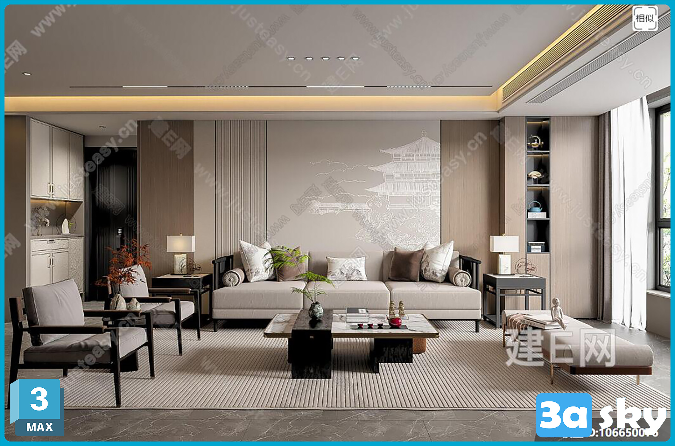 This 3D scene showcases a modern living room interior design with carefully selected furniture and decor. The contemporary layout and design elements create a stylish and inviting space. Explore the details of this 3D scene to gather inspiration for your own interior design projects.