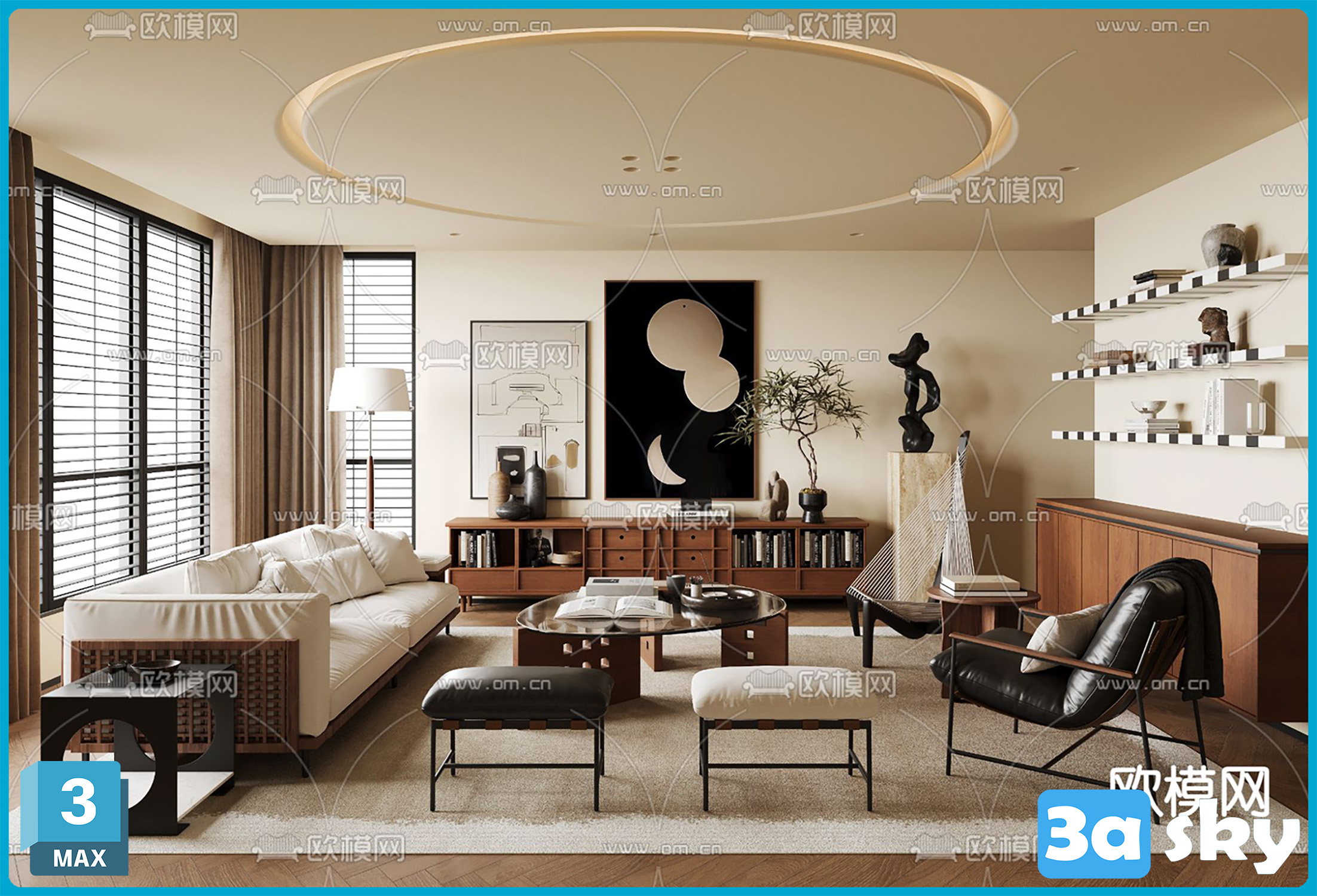 This 3D scene showcases a modern living room interior design with carefully selected furniture and decor elements. The space exudes a contemporary vibe with a focus on both style and functionality. Explore the details of this beautifully designed room and get inspired for your own interior design projects.