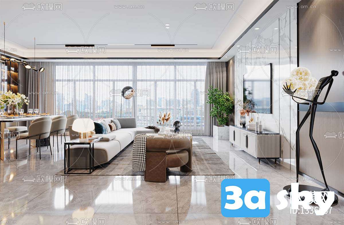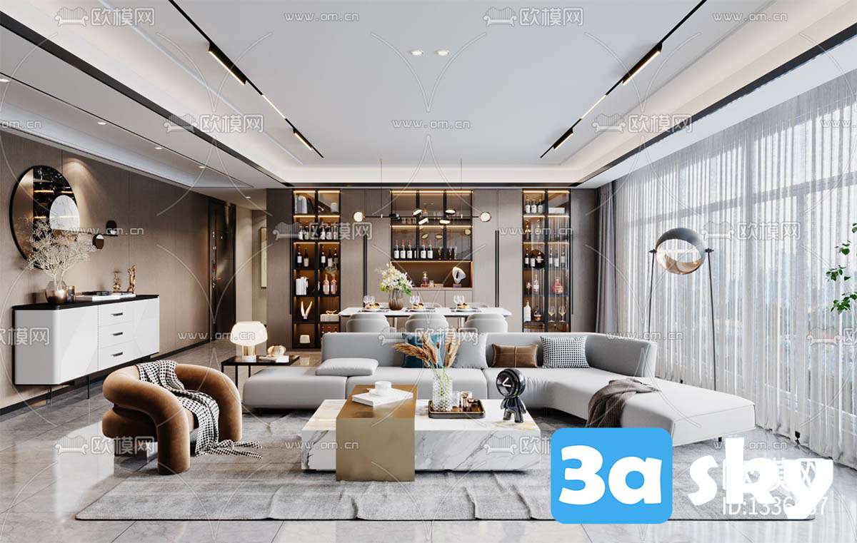 This 3D scene showcases a modern living room interior design with contemporary furniture and decor. The room features a stylish sofa, coffee table, rug, and decorative items. The color scheme is neutral with pops of color for a vibrant touch. Perfect for interior design enthusiasts and architects looking for inspiration.