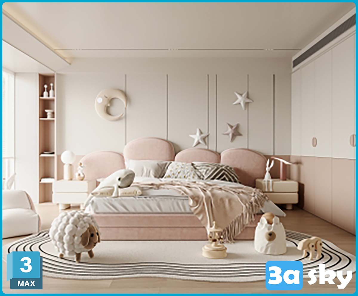 V_现代女孩儿童房床床头柜饰品窗帘地毯床头背景衣柜ID1124867710.zip