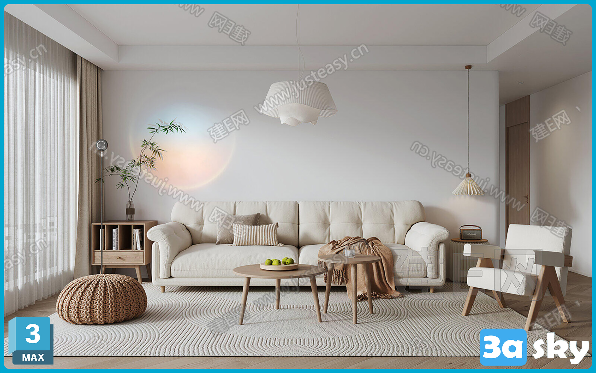 This 3D scene showcases a modern living room interior design with a focus on contemporary style and functionality. The scene features carefully selected furniture and decor elements that create a harmonious and inviting space. Explore the perfect blend of modern aesthetics and practical design in this captivating 3D visualization.