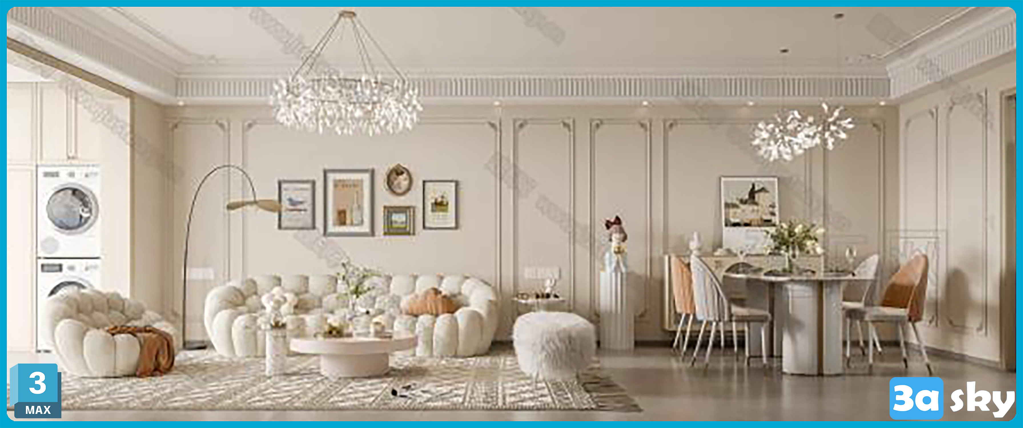 This 3D scene showcases a modern living room interior design with stylish furniture and contemporary decor. The scene features a cozy seating area, elegant lighting, and a sleek color palette. Perfect for visualizing interior design concepts and decor ideas.