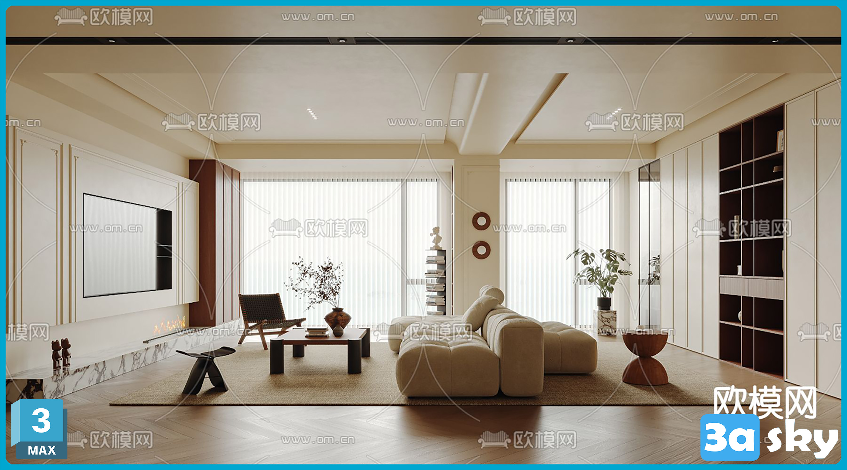 This 3D scene showcases a modern living room interior design with contemporary furniture and decor. The room features a stylish sofa, coffee table, and decorative elements. Perfect for inspiration and visualization projects.