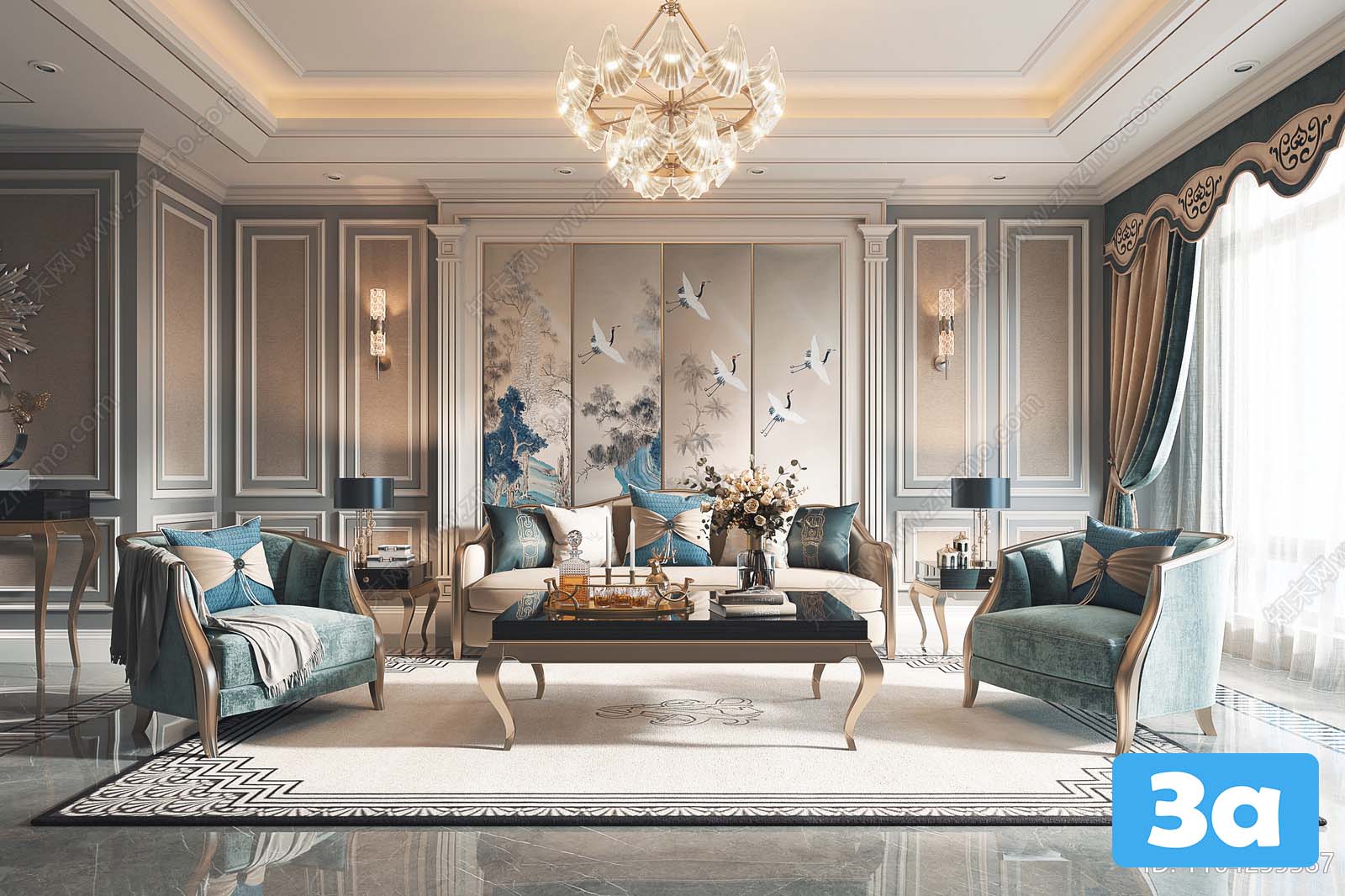 This 3D scene showcases a modern living room interior design with carefully selected furniture and decor items. The space exudes a contemporary vibe with its clean lines, neutral color palette, and stylish accents. Step into this virtual room to experience the perfect blend of aesthetics and functionality.