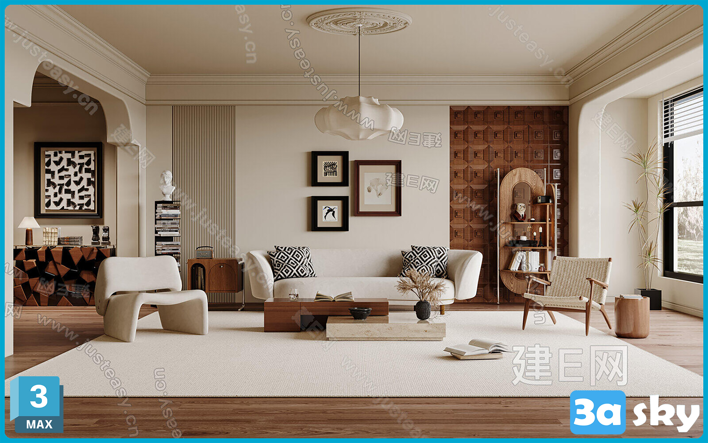 This 3D scene showcases a modern living room interior design with carefully selected furniture and decor. The contemporary layout and stylish elements create a welcoming and aesthetically pleasing space.