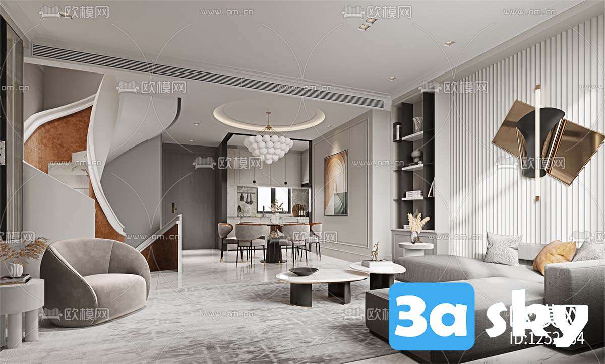 This 3D scene showcases a modern living room interior design with carefully selected furniture and decor. The space exudes a contemporary vibe with its clean lines, neutral color palette, and stylish accents. Explore the perfect blend of style and functionality in this beautifully designed living room setting.