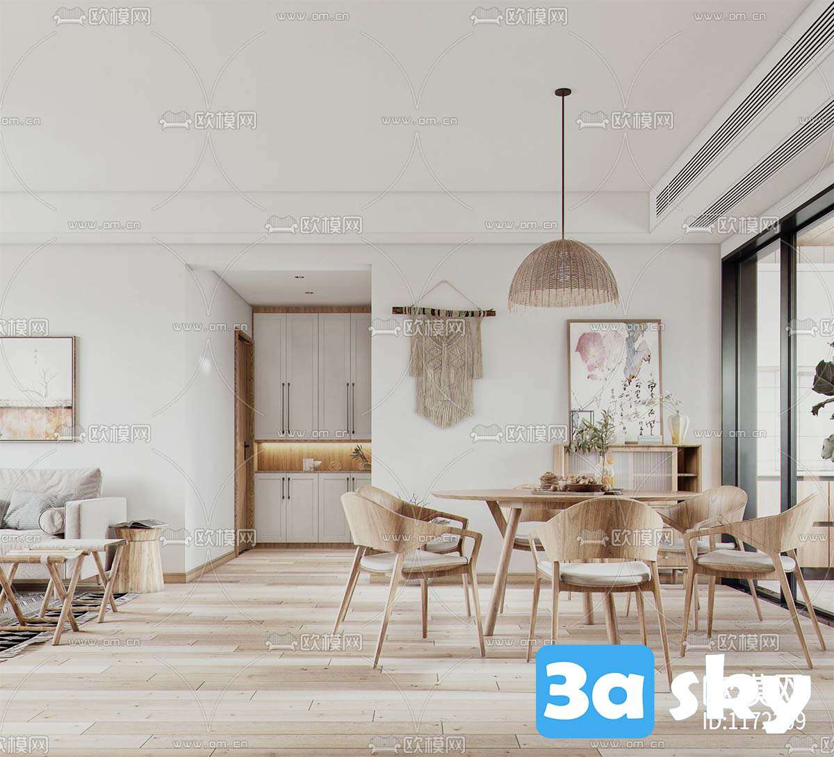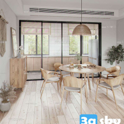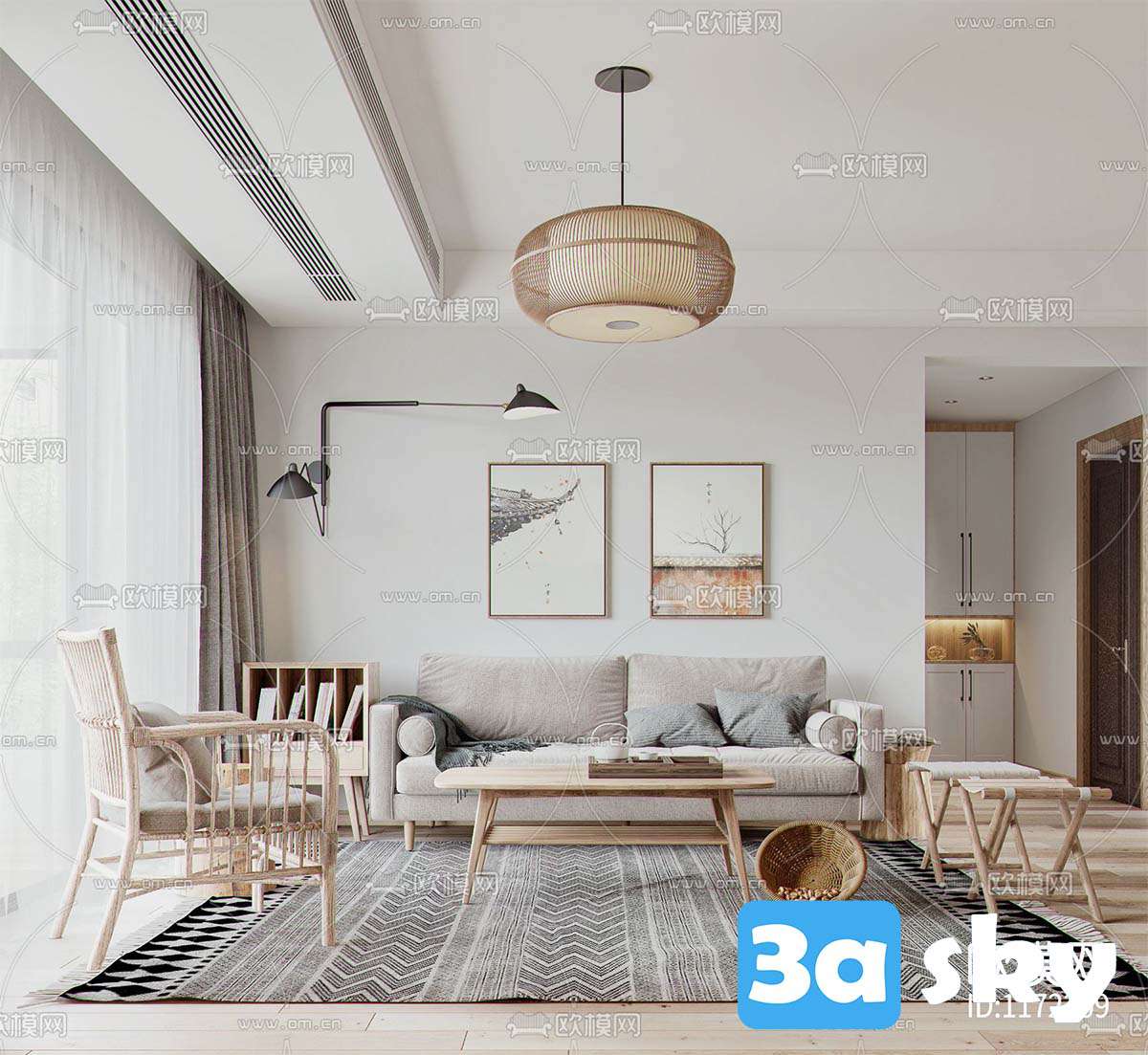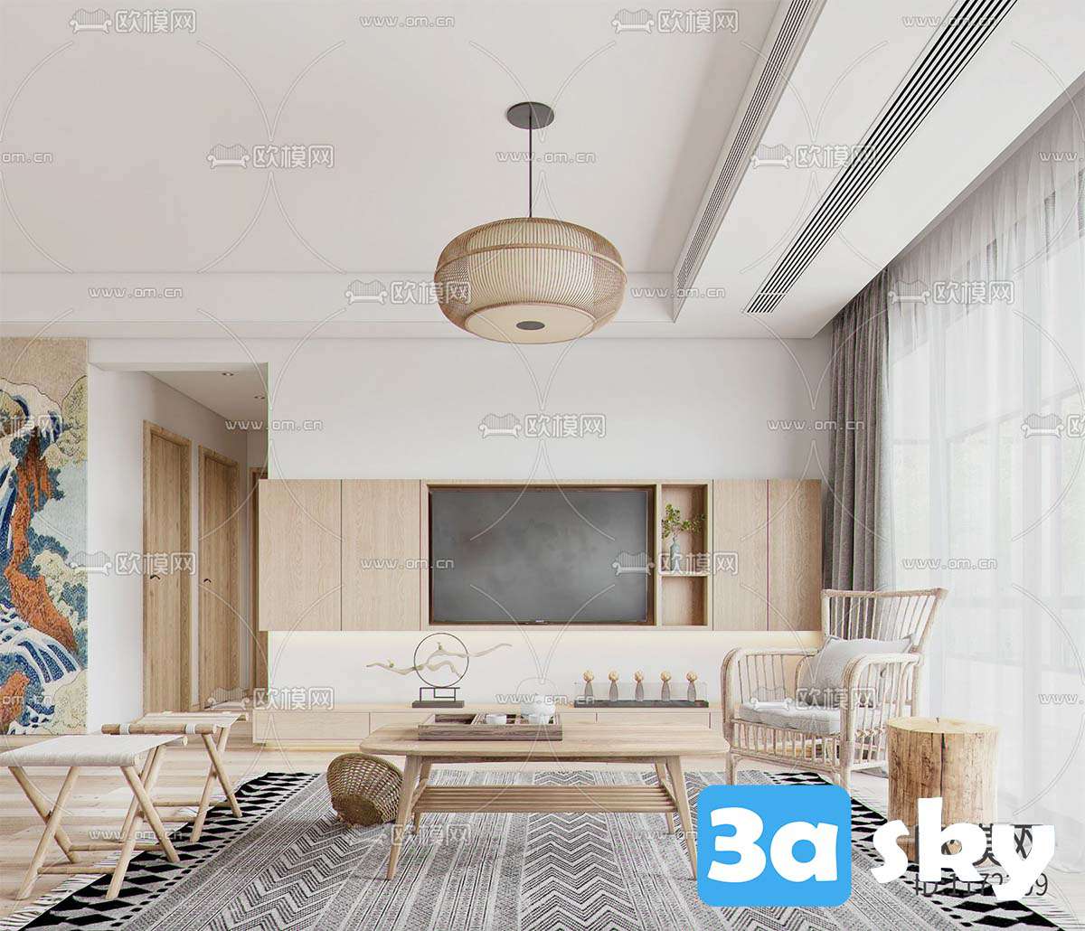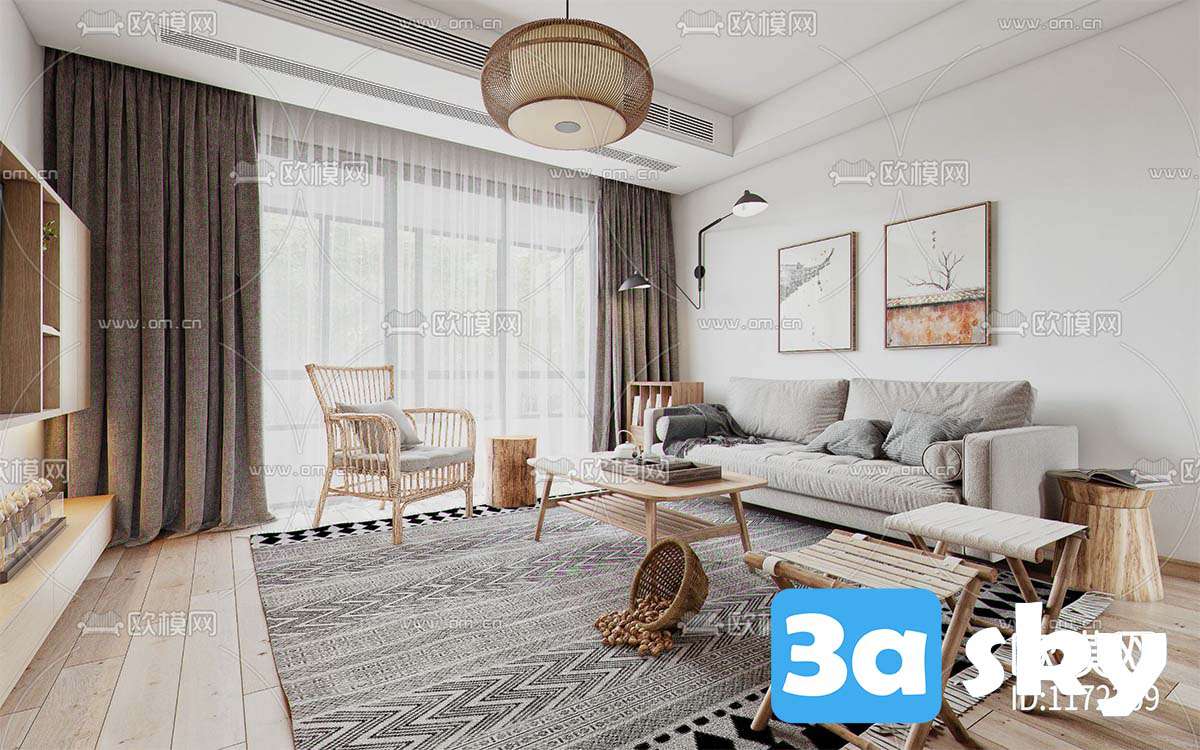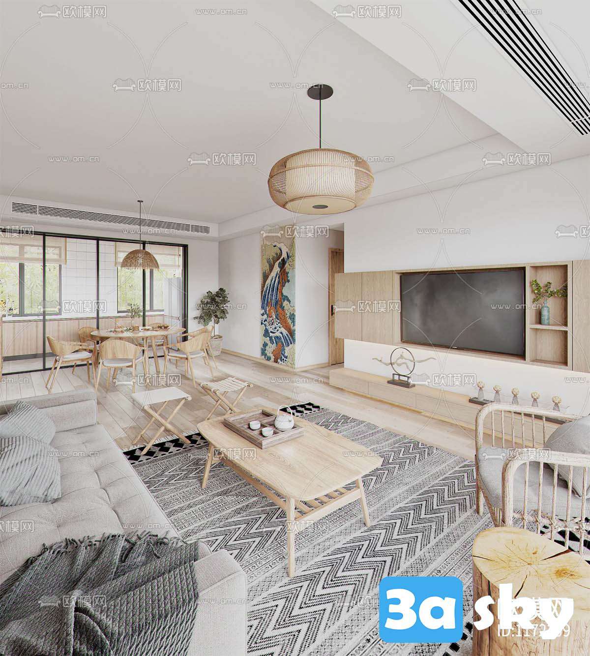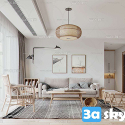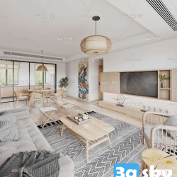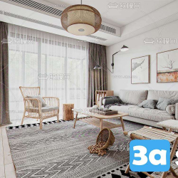 This 3D scene showcases a modern living room interior design with contemporary furniture and decor. The room features a stylish sofa, coffee table, and decorative elements. Perfect for interior design enthusiasts and professionals looking for inspiration.
