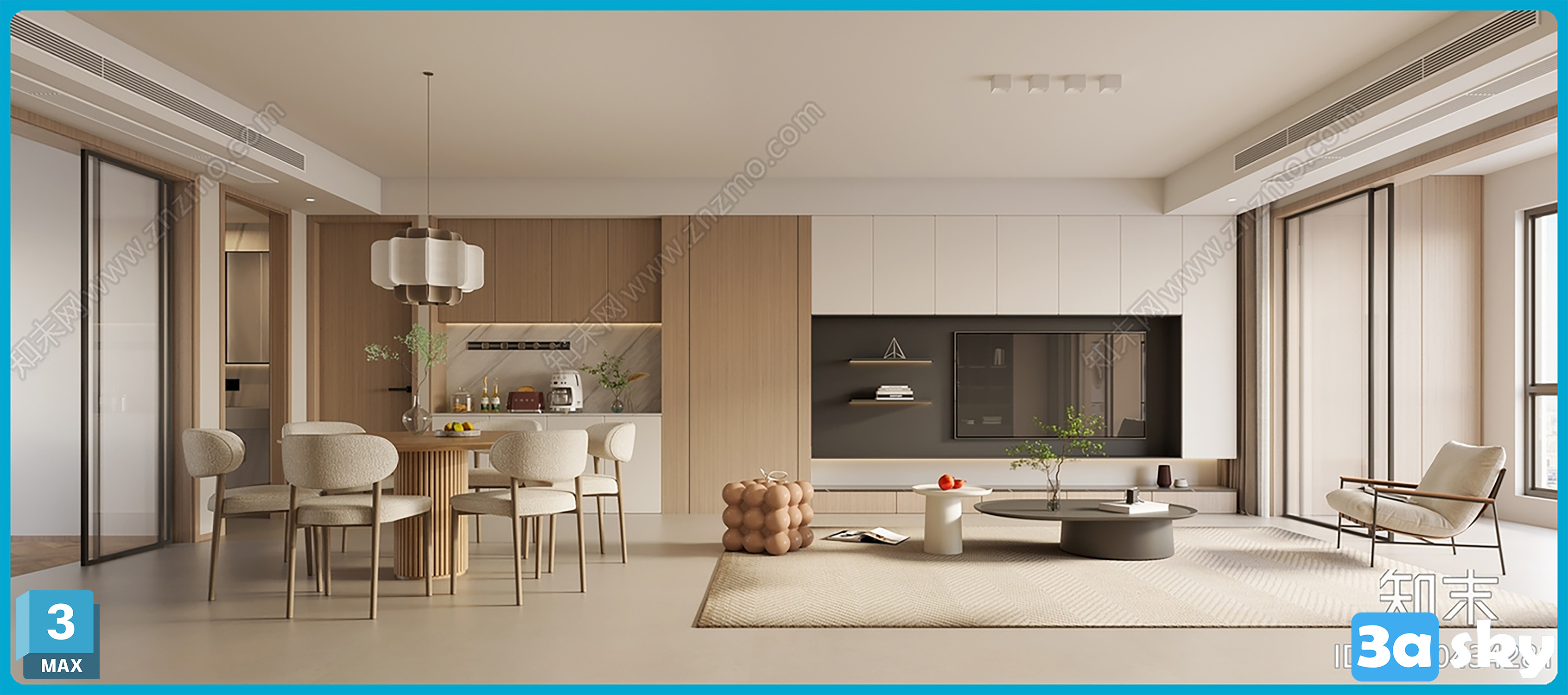 This 3D scene showcases a modern living room interior design with carefully selected furniture and decor. The contemporary layout and design elements create a stylish and inviting space. Explore the details of this 3D scene to gather inspiration for your own interior design projects.