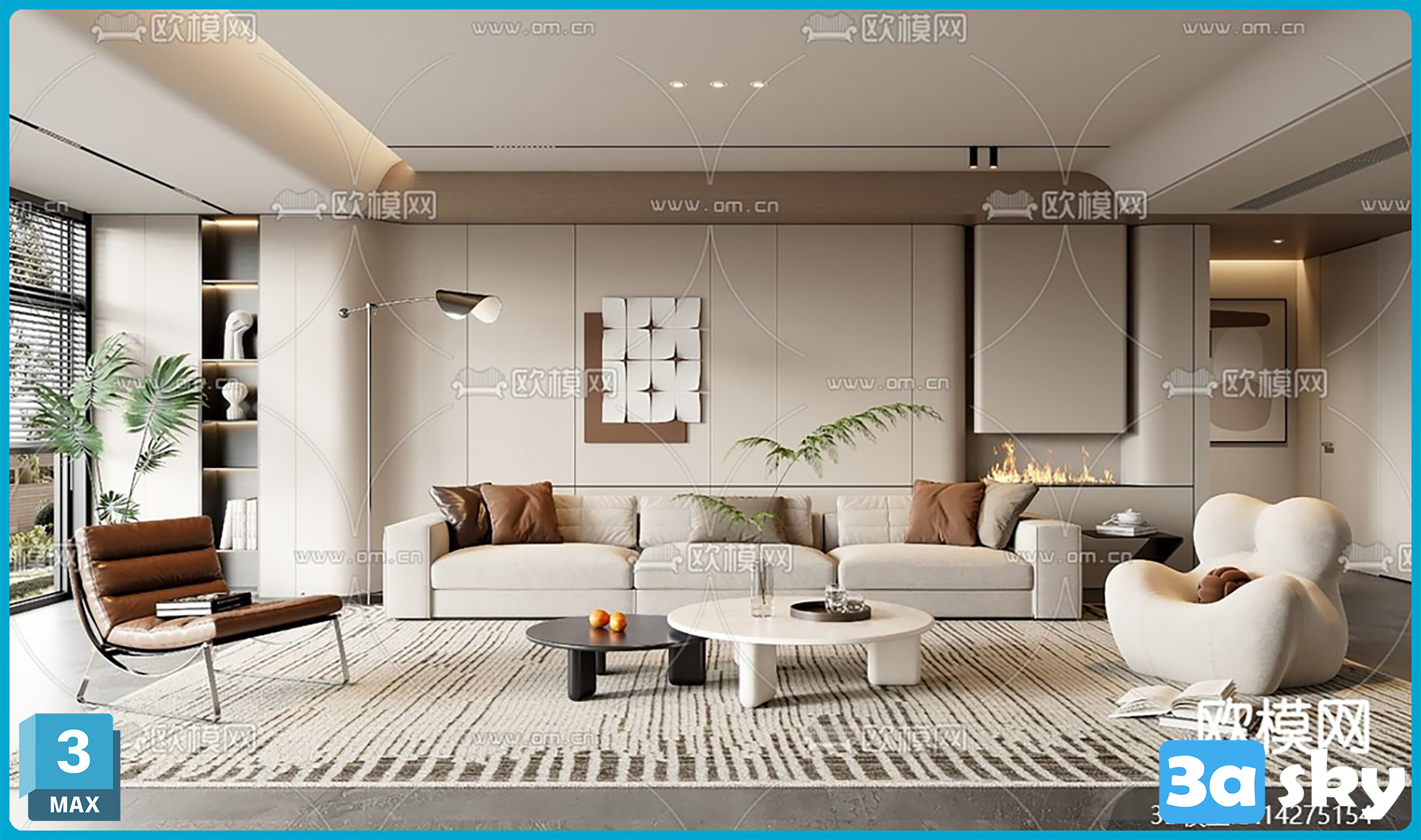 This 3D scene showcases a modern living room interior design with contemporary furniture and a stylish layout. The room features a comfortable sofa, elegant coffee table, and chic decor elements. The color scheme is neutral with pops of color for a vibrant touch. Experience the beauty of modern interior design in this captivating 3D scene.