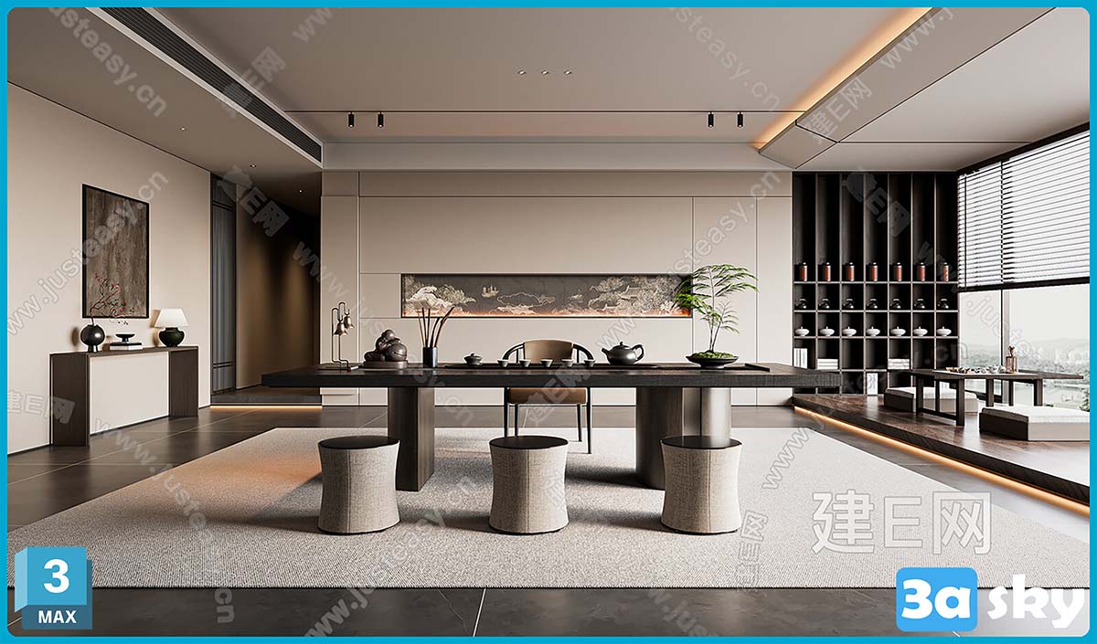 This 3D scene showcases a modern living room interior design with contemporary furniture and decor. The room features a stylish sofa, coffee table, and decorative items. Perfect for inspiration and visualization projects.